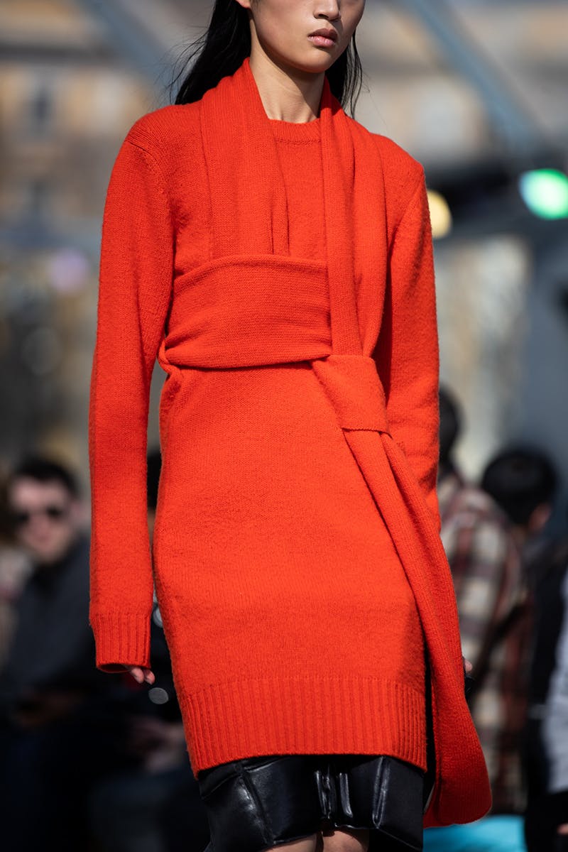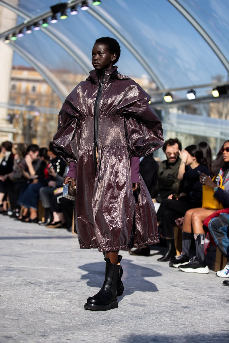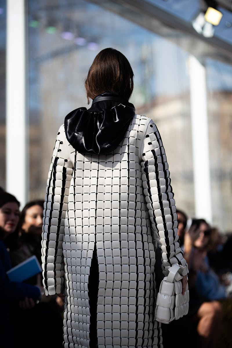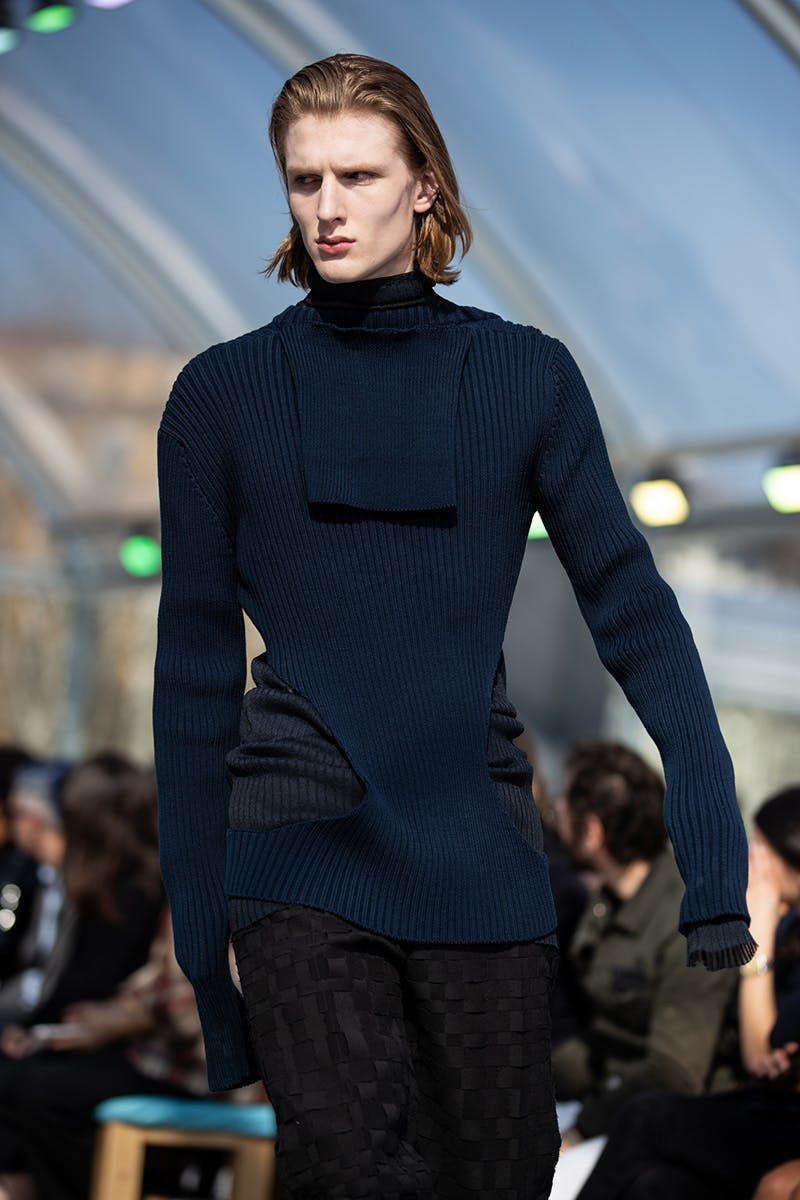 For menswear, desire and beauty came in the form of leather pants (which arrived in quilted and weaved variations), large cloak-like coats with distinct triangular detailing, sheer polo necks, and knitwear with cut-outs from the chest and hips. This freedom to expose the skin and fabrics underneath, married with super long sleeves and futuristic boots, sealed the new Bottega silhouette as one that signals a feeling of protection and, paradoxically, unrepentant vulnerability.