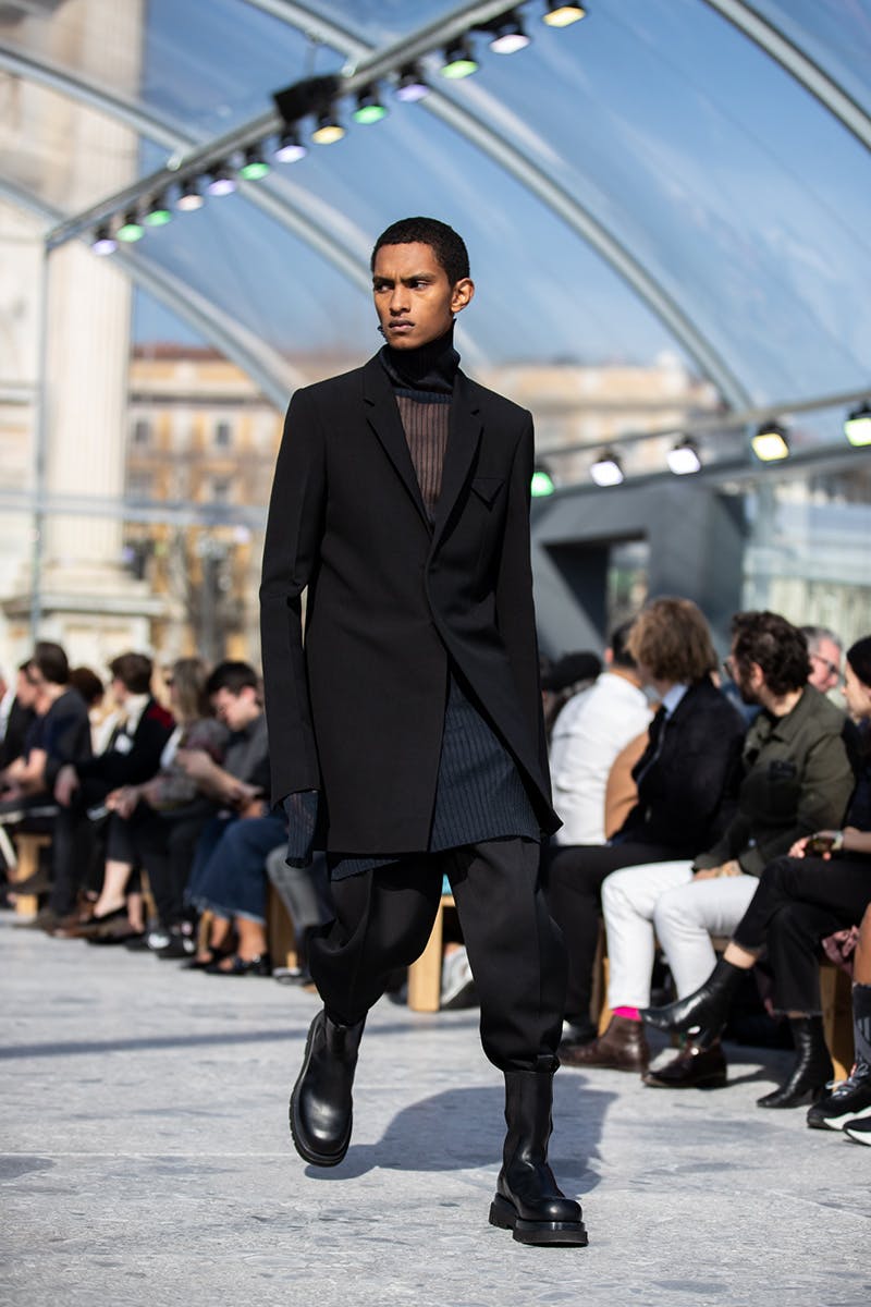 Lee, the former director of ready-to-wear at Phoebe Philo's Céline, is folding Bottega Veneta into the lexicon of modern luxury, and doing so without making too much noise about it. For menswear, 2019 has become a tricky balancing act of tailoring, futuristic design, and streetwear, which was all served in Lee's collection today. The Robocop-style footwear was merely an added bonus.
