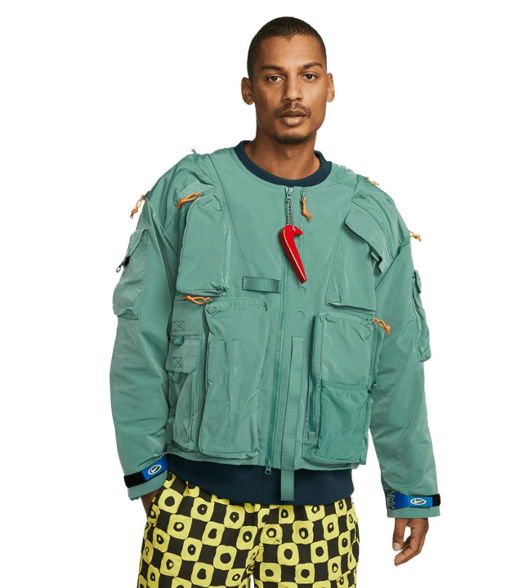 The collection's $400 multi-pocketed jacket undoubtedly oozes outdoorsy feels. Taking notes from Nike's ISPA vest, the water-repellent jacket emulates a fisherman's vest with sleeves, toting an abundance of pockets and dangling Swoosh charms.
