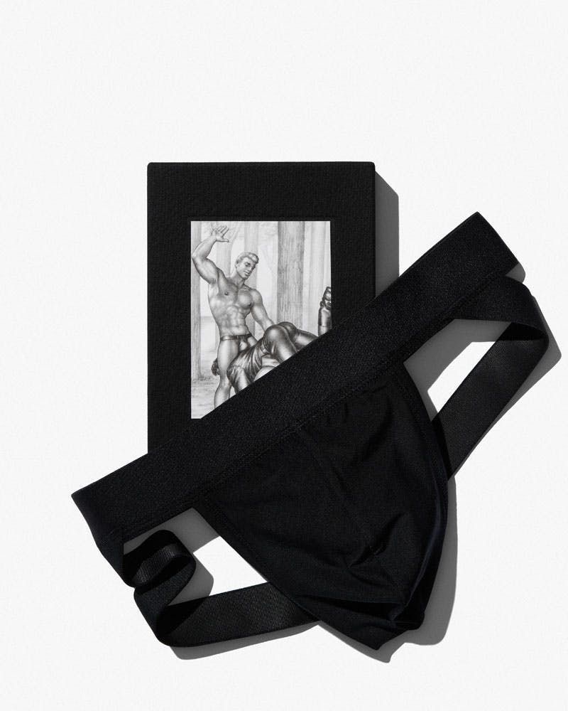 The tank top and jock-strap (what else?) are inspired by two graphite on paper original sketches from 1986 and 1961 respectively. Both items are crafted in silky lyocell with the tank featuring a Tom 1986 embroidery at the hem, and the jock-strap is simply customized with embroidery reading 'Tom.'