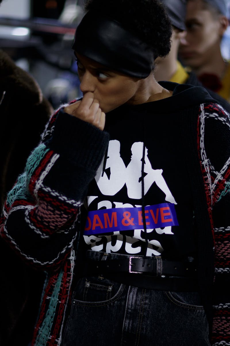 Christian Dada FW18 included a Kappa collab — the brand's iconography ran down the side of shirting and appeared on tees — shout-outs to guitar effects manufacturer BOSS and Morikawa's own version of the beyond-hyped merch tee trend. Esoteric quotes, lavish embroidery and raw hems added runway polish to a collection that was Dada in name, and Dada in nature.