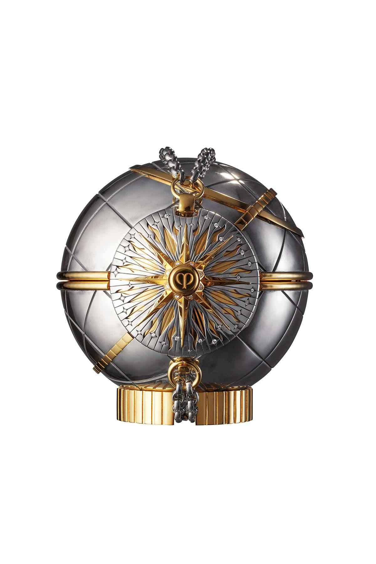 First up is Top's take on La Crème, the brand's beloved night cream. The jeweler constructed a globe-shaped "safe" that houses the retinol-rich moisturizer, jars of which retail between $550 and $795. A nod to Clé de Peau's name, which translates to "Key to Skin," Top designed an accompanying treasure that unlocks the silver and gold globe.