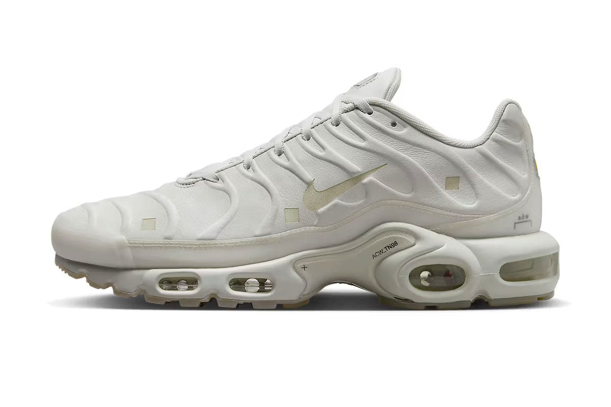 Focusing on the details shows that each of Air Max Plus sneakers – “Platinum Tint”, “Black” and "Blue" – feature a premium leather construction and square cut-outs on the side panels. Throughout, you'll find ACW* branding touches, while the shoe's iconic veins take on an embossed finish, almost as if the shoe is shrouded in cloth.