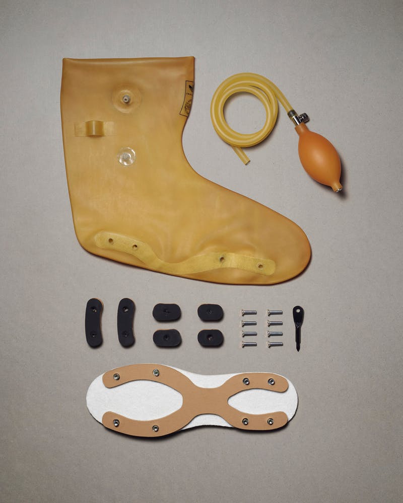 For the inflatable boot, the main body of the shoe was created with a latex dip molding factory that specializes in making things for medical use and diving suits. We had the initial parts of the shoe dipped to the “sock,” and then we joined them together, and created an internal insert for the sole. Then we wanted to create something that you could screw onto the outside, almost like a football cleat, but more raw looking.