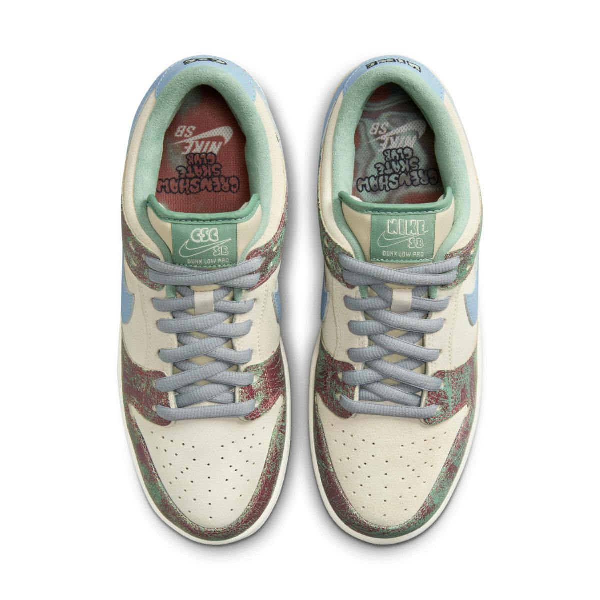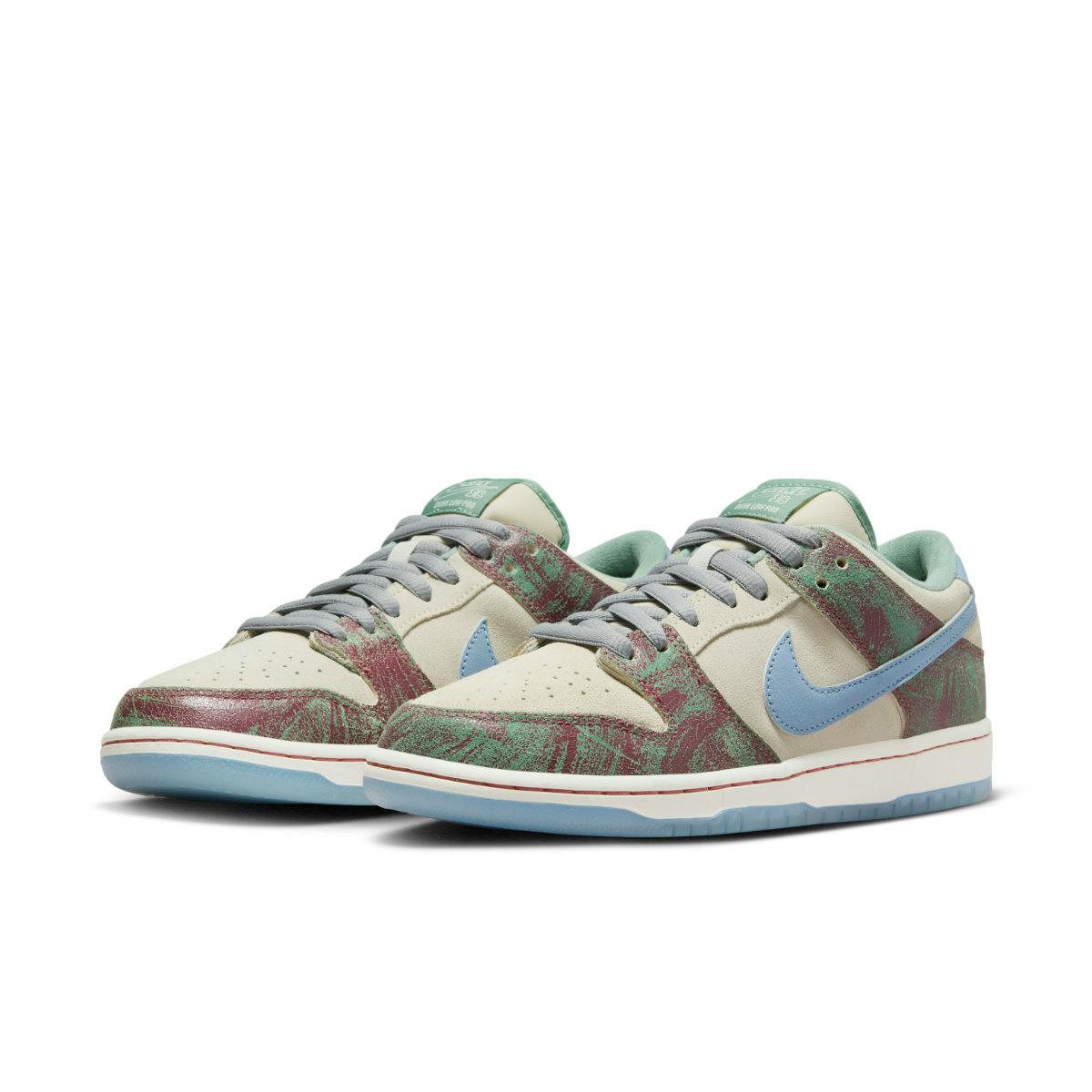 With Crenshaw Skate Club's first SB Dunk, CSC founder Tobey McIntosh takes fans back to where it all started: Crenshaw, California. Specifically, the collaborative Dunk shoe draws inspiration from the neighborhood's Crenshaw Square sign, borrowing its vibrant red and green hues for a distinct pattern atop crackled leather paneling.