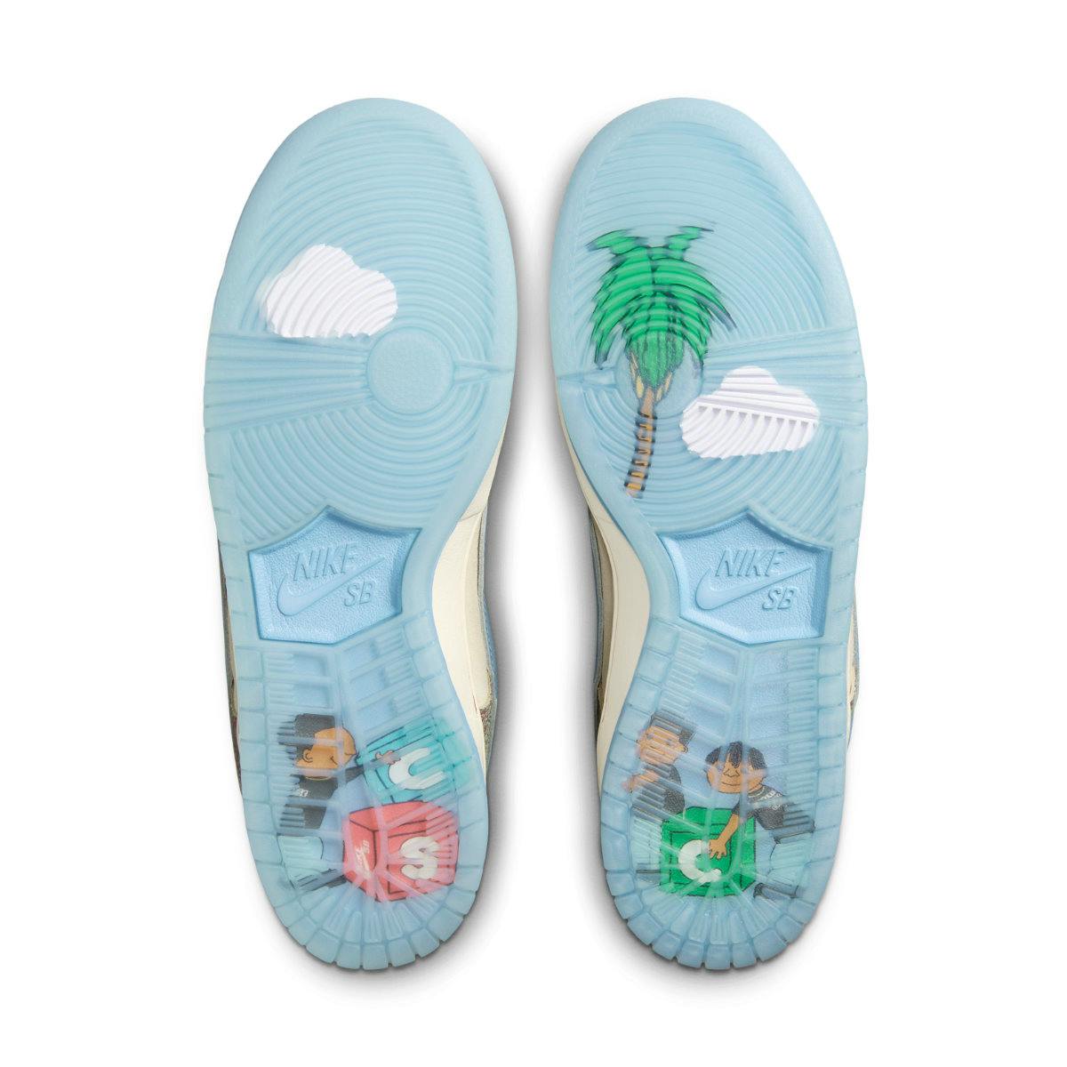 Crenshaw Skate Club's SB Dunk is complete with an icy translucent sole that reveals daycare-inspired drawings (similar illustrations also appear on the back of the tongue), nodding to McIntosh's childhood, where he spent most of his time trying out new tricks at Crenshaw Square and Fairfax.