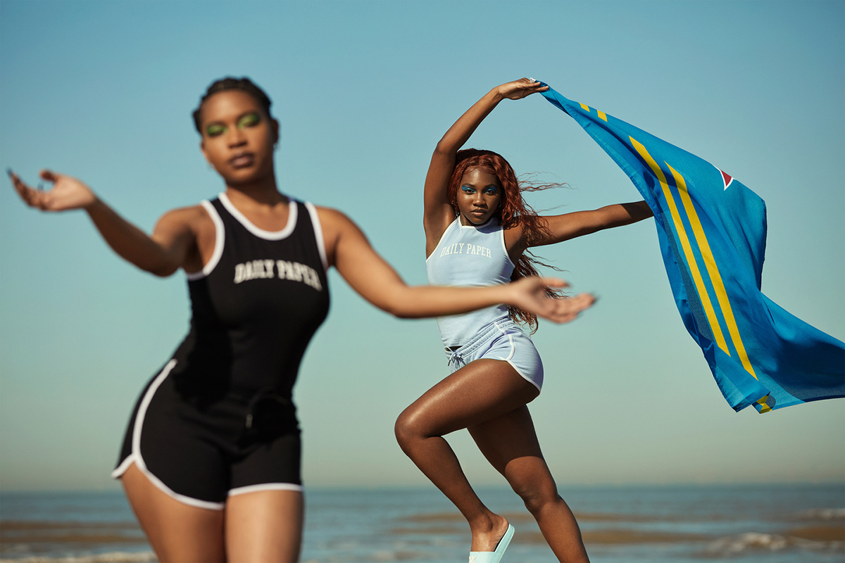 Elsewhere, Daily Paper has swimwear on-lock with a colorful take on its branded monogram print, which adorns the silky Remono dress and Rerise top. Reflecting the Ghanaian flag bright red, green, and yellow, the nostalgic feel of the line continues.