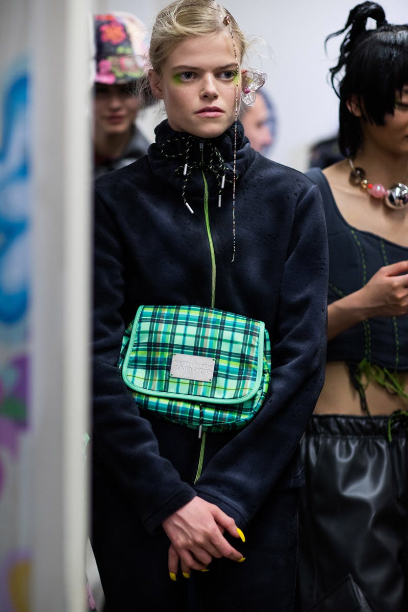 Key Pieces: A run of hyperactive flannel patterning, seen across school-like satchels, helped add a touch of much-needed playfulness to the collection’s somewhat grungy appeal. This playful edge was furthered by ’60s-style floral prints, which came on padded bucket hats, lightweight tops, and button-down puffer jackets. Garishly fashioned footwear helped break up the above by injecting harsher forms into the line, defined by pointed toes, and heavy-metal studding.