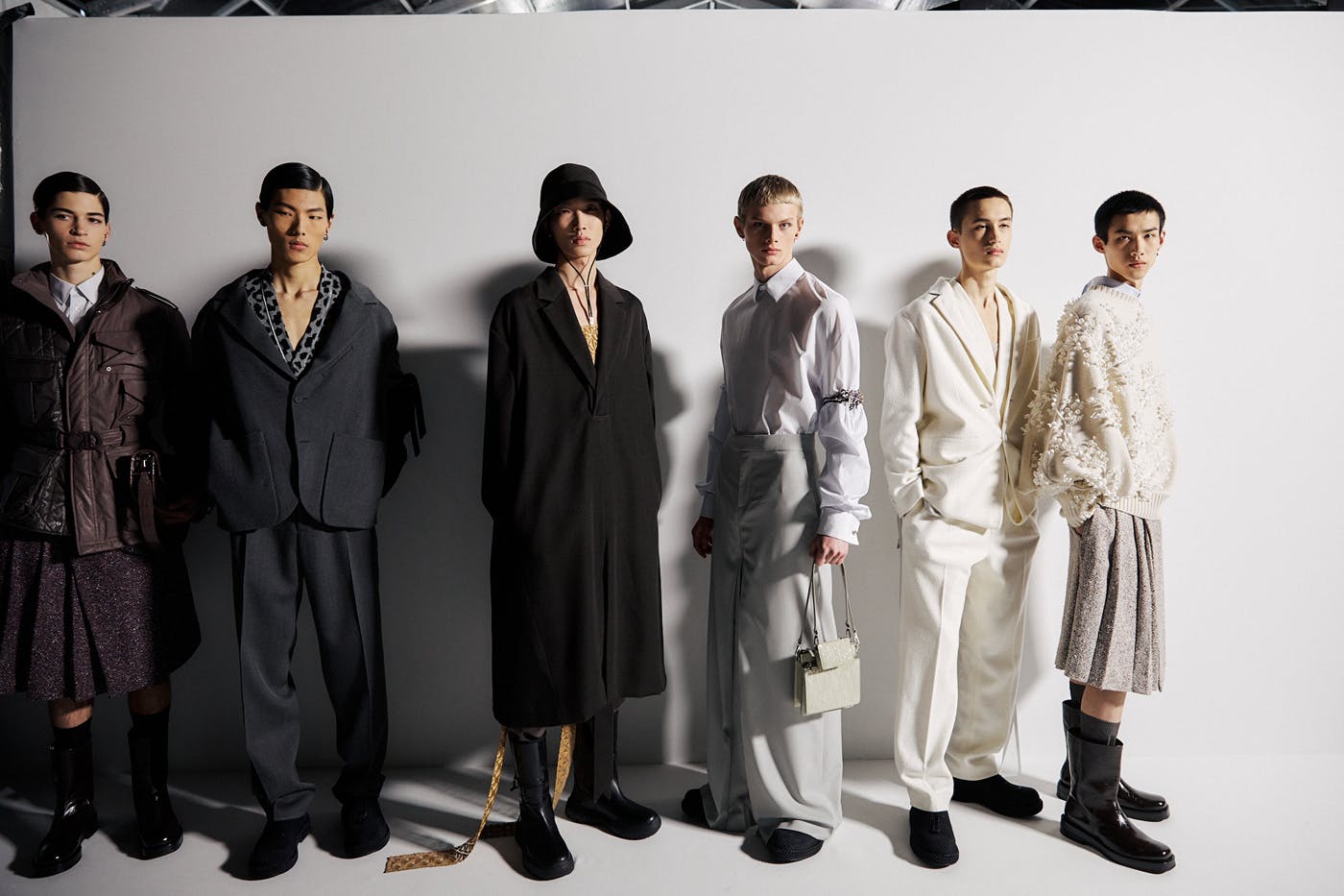 Plush, padded vests, bubbly knit sweaters, brushed cardigans, soft-shoulder wool suits, and fleece bombers offset the Dior show's moody lighting and theme, while technical accents — pullcords at the elbows of blazers, puffy gilets, cargo-pocketed field jackets — reminds one that Jones is dressing his dudes to stylishly survive the apocalypse.