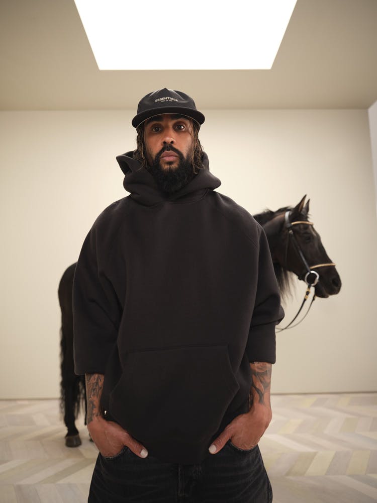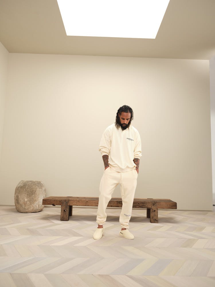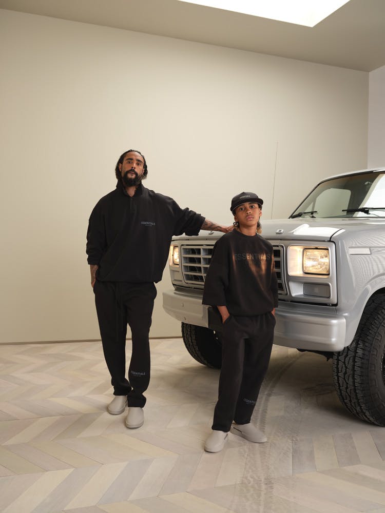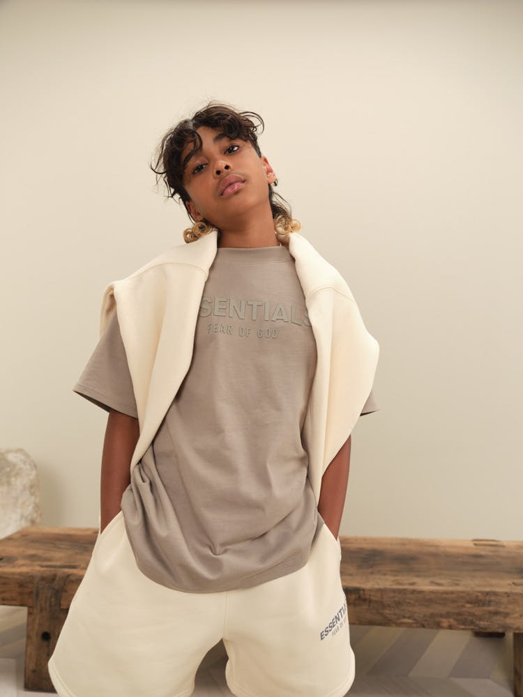 As seen on Lorenzo and in family in Shaniwa Jarvis' lush snapshots — alongside those forthcoming backless sneakers — ESSENTIALS' neutral shades are in full effect for ESSENTIAL Kids, with youngsters granted access to slouchy jersey T-shirts, polo shirts, and fleece sweaters emblazoned with the line's unmistakable all-caps branding. Evocative tones of "Buttercream," "Dark Heather Oatmeal," "Moss," and "Stretch Limo" complement each other and themselves with ease, making it a cinch to get ready for school, even if it's a digital class.