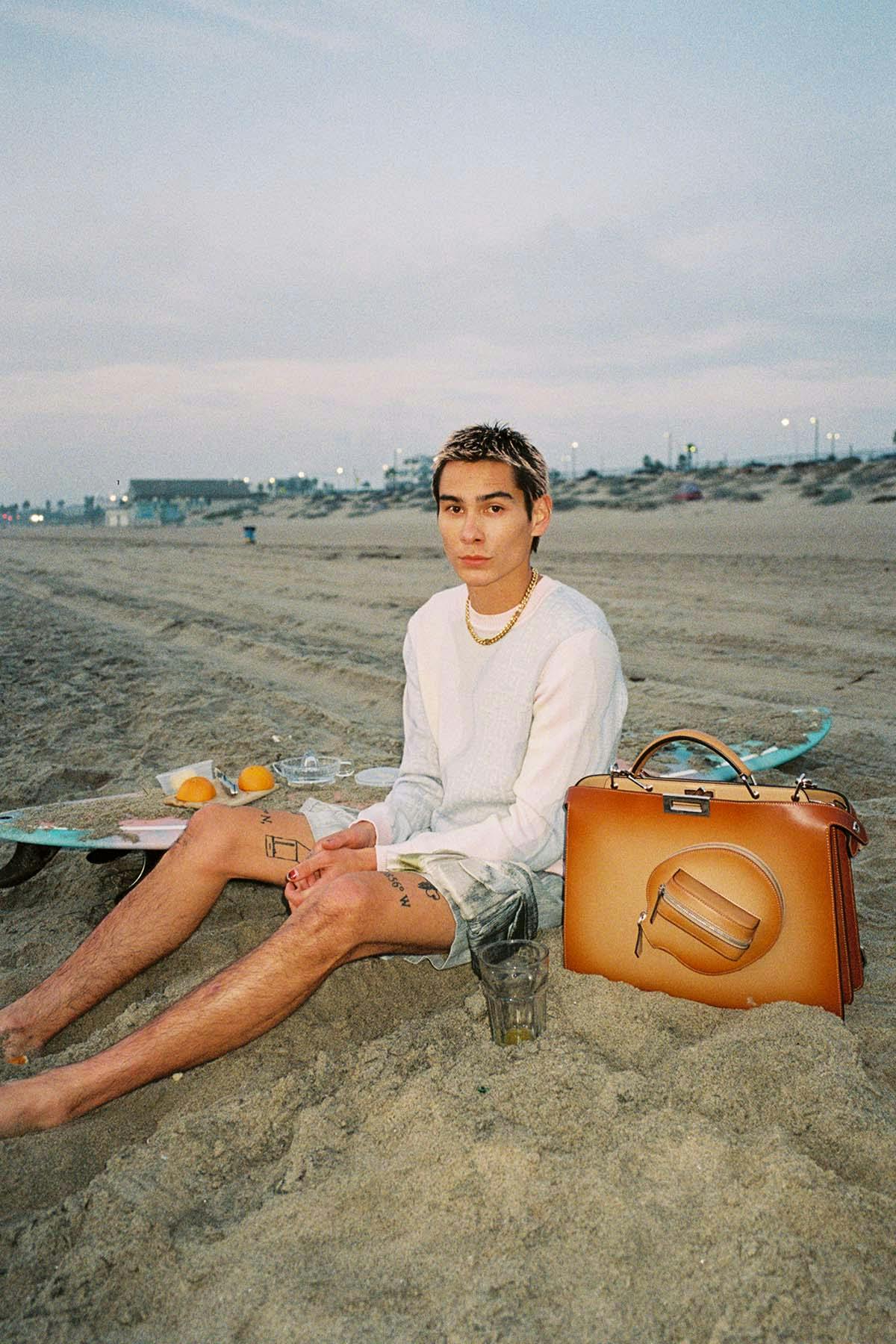 At the beach, Mock showcases Fendi’s focus on knitwear this season, dawning a sweater that incorporates FF logos and sherbert-colored hues reminiscent of changing sky by the seaside.