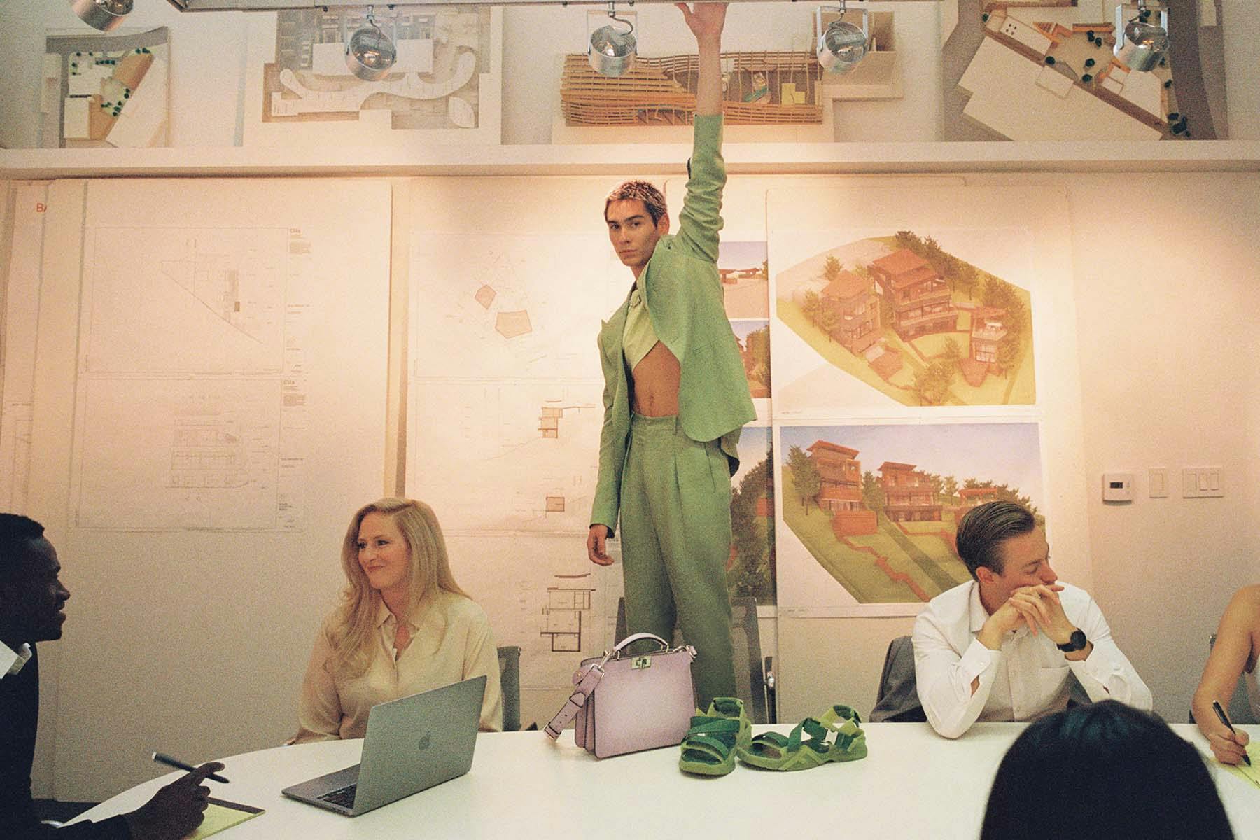 In an illustrative map of Rome-turned-cartographic drawing of the city adorned with freehand FF logos, the reimagined print (dubbed Fendi Earth) becomes a unique aesthetic touchpoint and is incorporated into various pieces throughout the collection. These include a linen silk suit, jacquard denim, and plush crochet tees. Finishing his look off with a bucket hat and the iconic Peekaboo bag in lavender, Mock hits the dancefloor with friends underneath neon strobe lights.