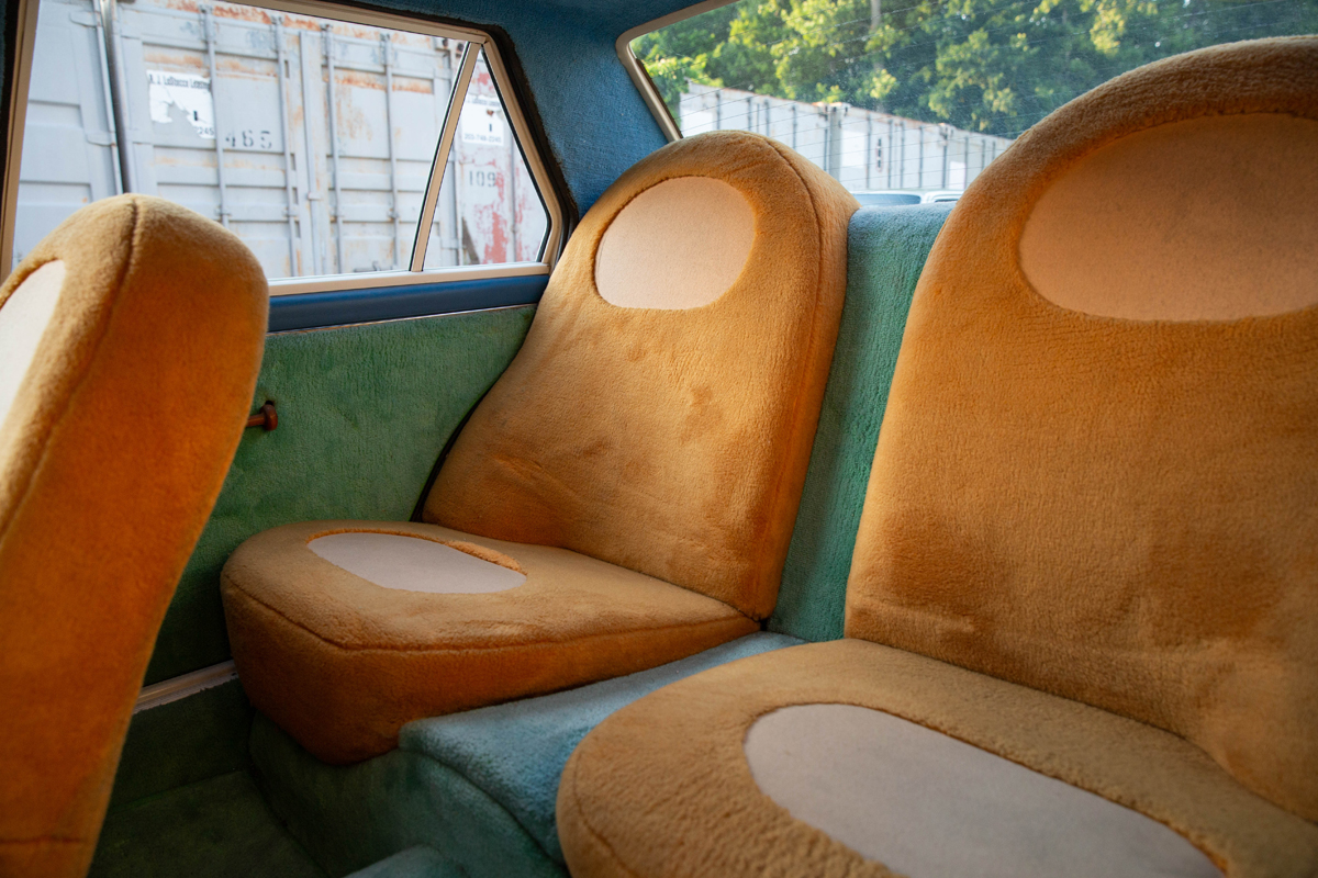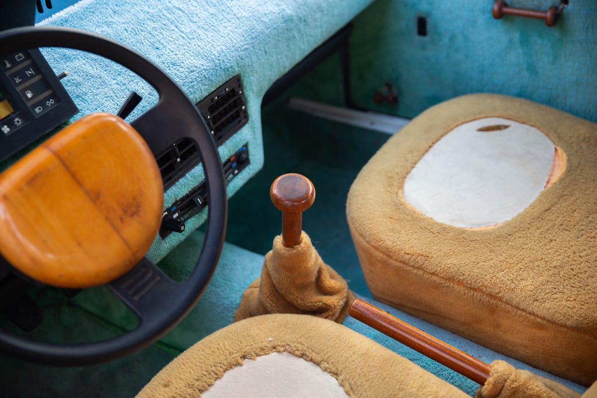 The Punk practically screams “artsy,” with a splatter-style impasto paint job – splashes of green, red, blue, and yellow flung over a base of thick ivory-white. Its custom tires, courtesy of Pirelli, are made from a blue rubber compound, and there’s matching vinyl in the same peacock shade upholstering the bumper, side skirts, and wheel arches. Inside, the car is carpeted in fuzzy green and gold with fleece-y fabrics Fiorucci designed for the project. Wooden detailing like the sculptural stick lever are all hand-carved under the direction of Sottsass and Branzi, the most idiosyncratic being the handles on the inside of the passenger doors, which look like wooden toilet paper dowels dangling from strings. Hale acknowledges the car’s wacky and whimsical design language is evocative of the Memphis movement that emerged in the early ‘80s, but it’s more accurate to understand the car as part of the story of Studio Alchimia, founded in 1976, which Memphis grew out of (Sottsass and Branzi were part of both). “It is really like an Alchimia car,” says Hale.