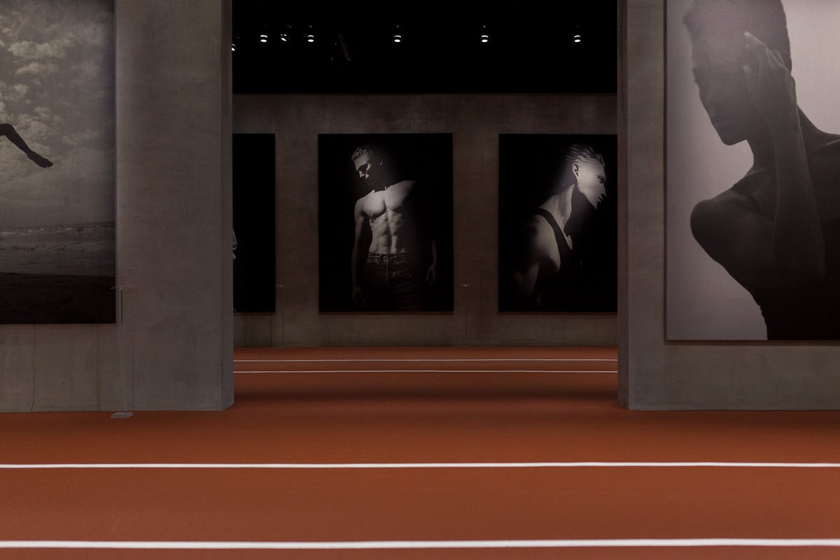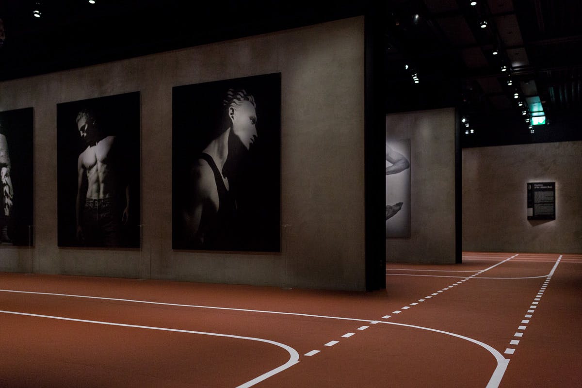 Immediately upon entry, the exhibition space is deeply immersive. A running track floor signals the beginning of an athletic journey. Armani's work comes alive within the lowly lit concrete walls; the surrounding architectural aesthetic is brutal and minimalist. Much of the photography captures movement perfectly, but video projections quite literally place you in the action.