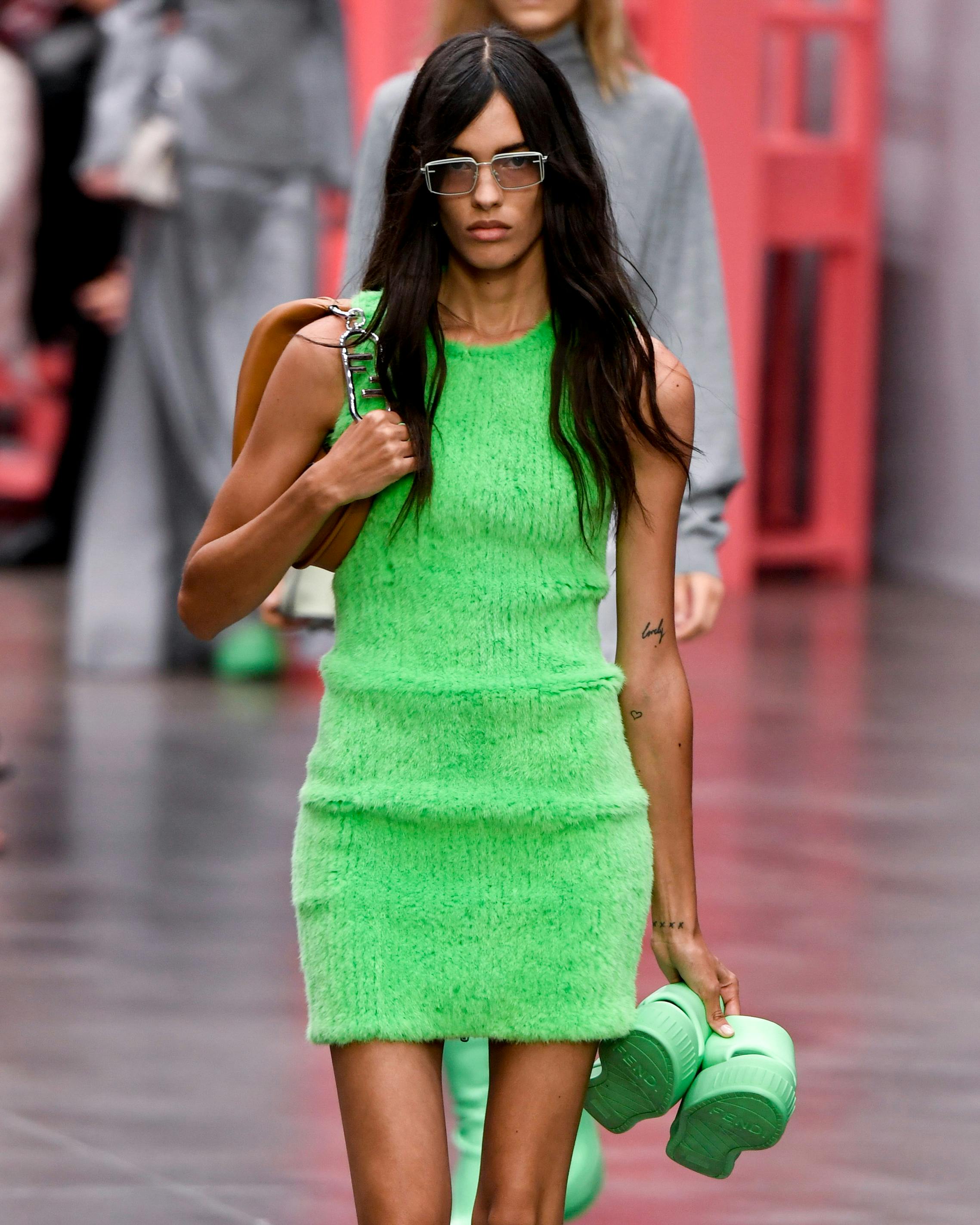 Grace Valentine’s platforms are precipitous, five maybe six inches high. Unlike many of the other models whose dayglo is tempered by Fendi’s signature neutrals, Valentine is a full spotlight of green: soft green mini that hits above the knees (velour or mohair or something in between?), and green platforms. Valentine is midway across the room when they stop, remove their shoes, take them in hand, and continue walking.