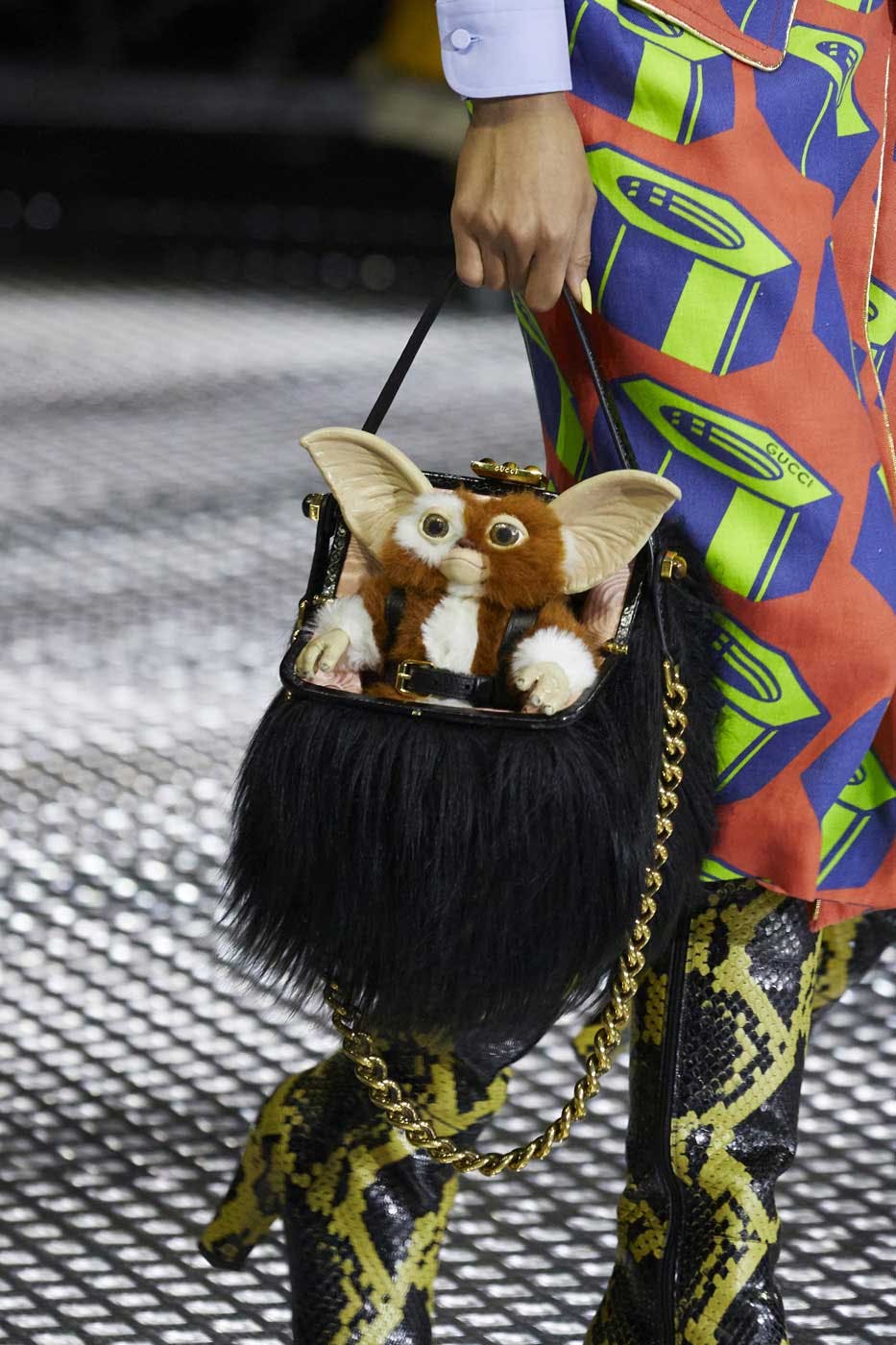 Yes, the adorable star of Joe Dante's landmark Gremlins took the runway alongside the twinning models, hidden inside Gucci's accessories or clutched alone.