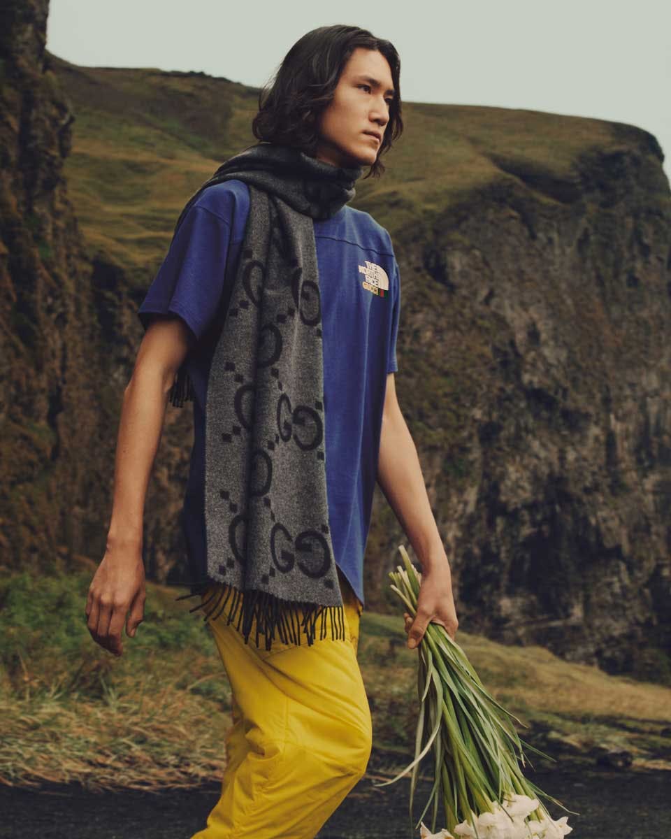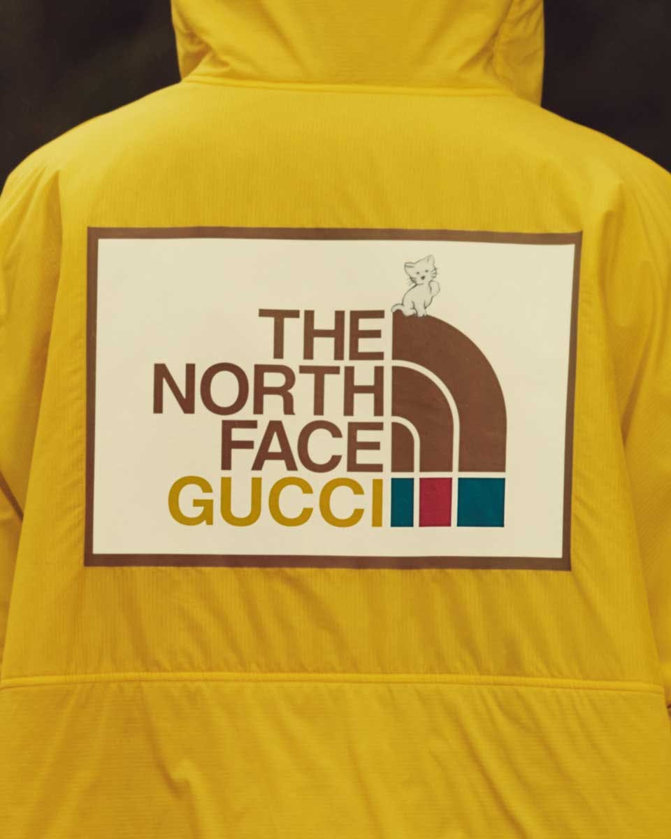 Retro TNF gear inspired Gucci to create the 130+-piece collaborative collection, which transform old-school Nuptse jackets, duvet coats, wading pants, and shoulder bags with vivid organic patterns, all-over monograms, and plentiful co-branding.