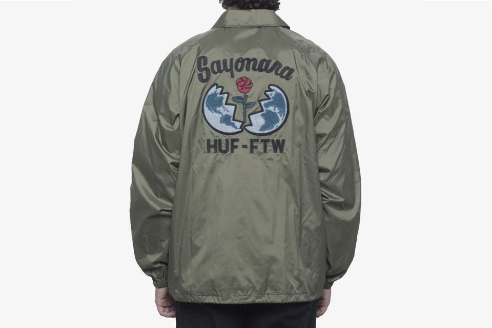 The collection includes outerwear, pullovers, T-shirts, pants, and footwear, the majority of which are emblazoned with HUF branding and select graphic prints that include Japanese references.