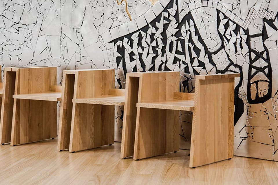 Inside, the 500-seater church blends white walls with wooden benches. Two marble lines run from the exterior along the wooden floors, one representing the River Jordan, where Jesus was baptized, and running to the baptismal font, and the other representing the Sword of St. James (Santiago in Portugal and Spain) and running to the pulpit, behind which is a large mural.