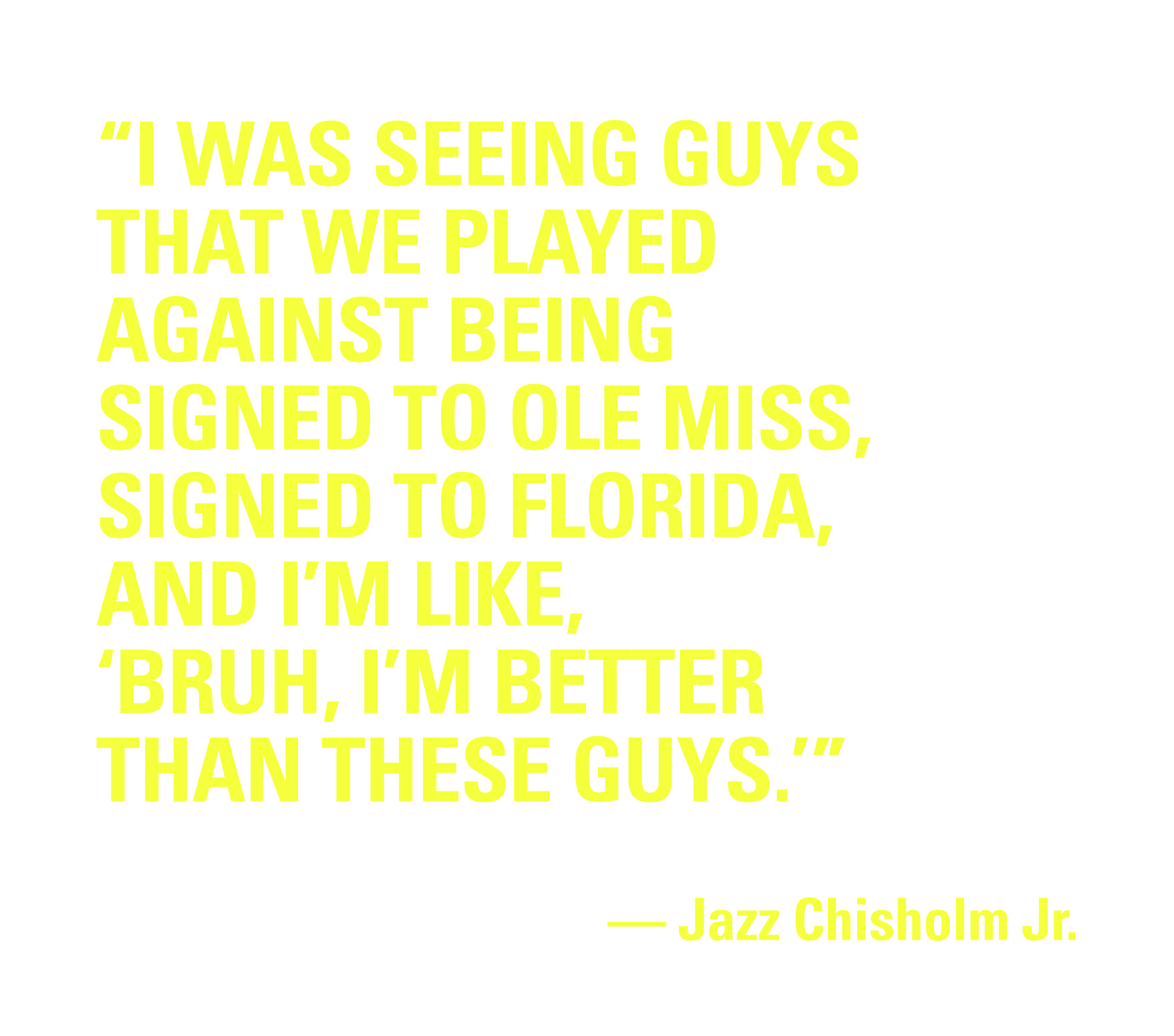As intoxicating as his new freedom was, the baseball side of things took some adjusting to. Life Prep, his new school, wasn’t exactly a sports powerhouse. There were maybe 300 kids total, Chisholm says. And while the school did have strong international talent and often faced stiff competition, the scouts who attended games were rarely there to see Chisholm and his teammates. He took this as a challenge. “I was seeing guys that we played against being signed to Ole Miss, signed to Florida, and I’m like, ‘Bruh, I’m better than these guys,’” he says.