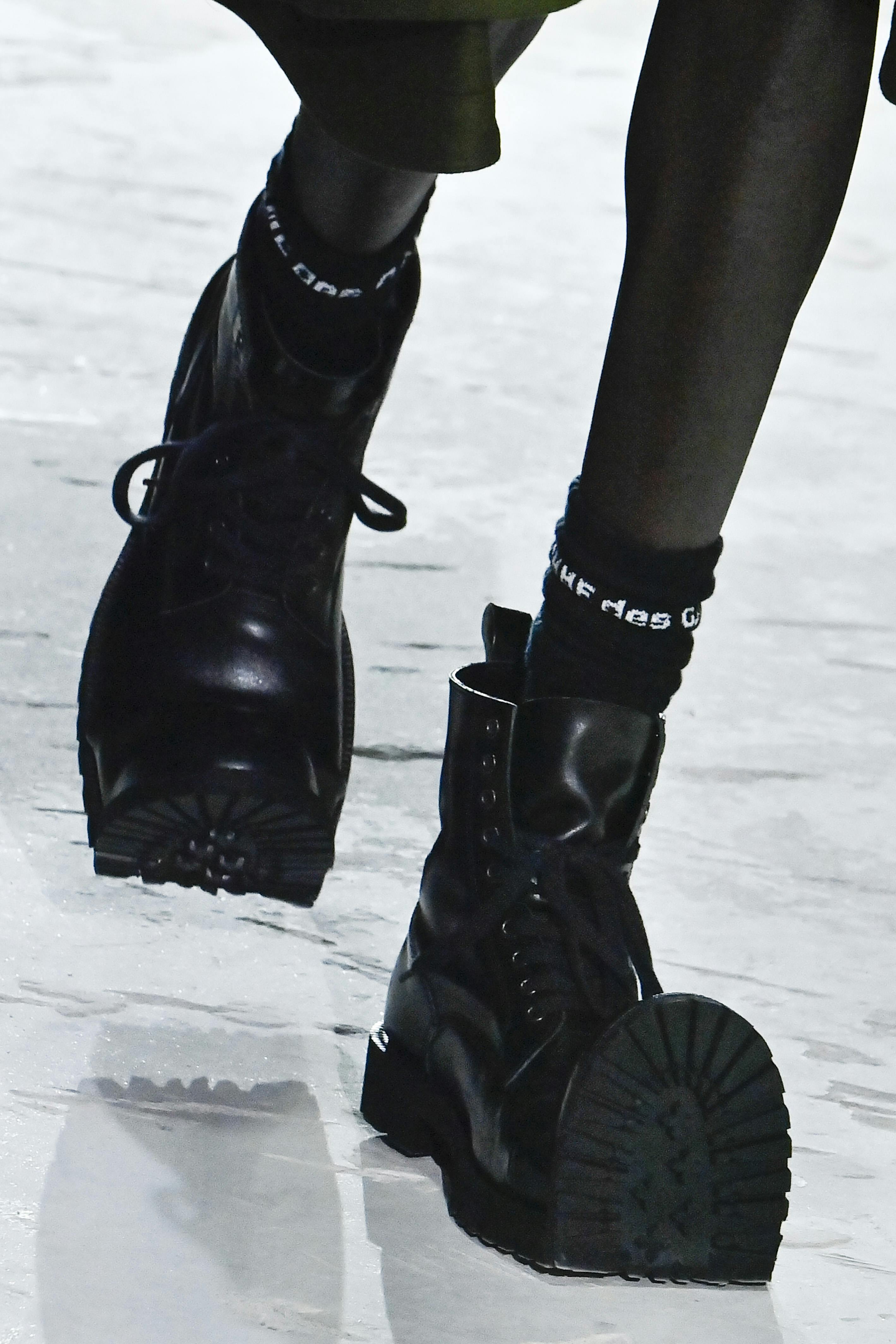 About half of the combat boots in the latest COMME des GARÇONS HOMME PLUS show were what you’d expect: Rugged, bulky, and crafted from black or oxblood leather. The other half were not: The chunky soles formed a sharp right angle, making the toeboxes point up into the sky and the leather buckle under the pressure of their dramatic shape.