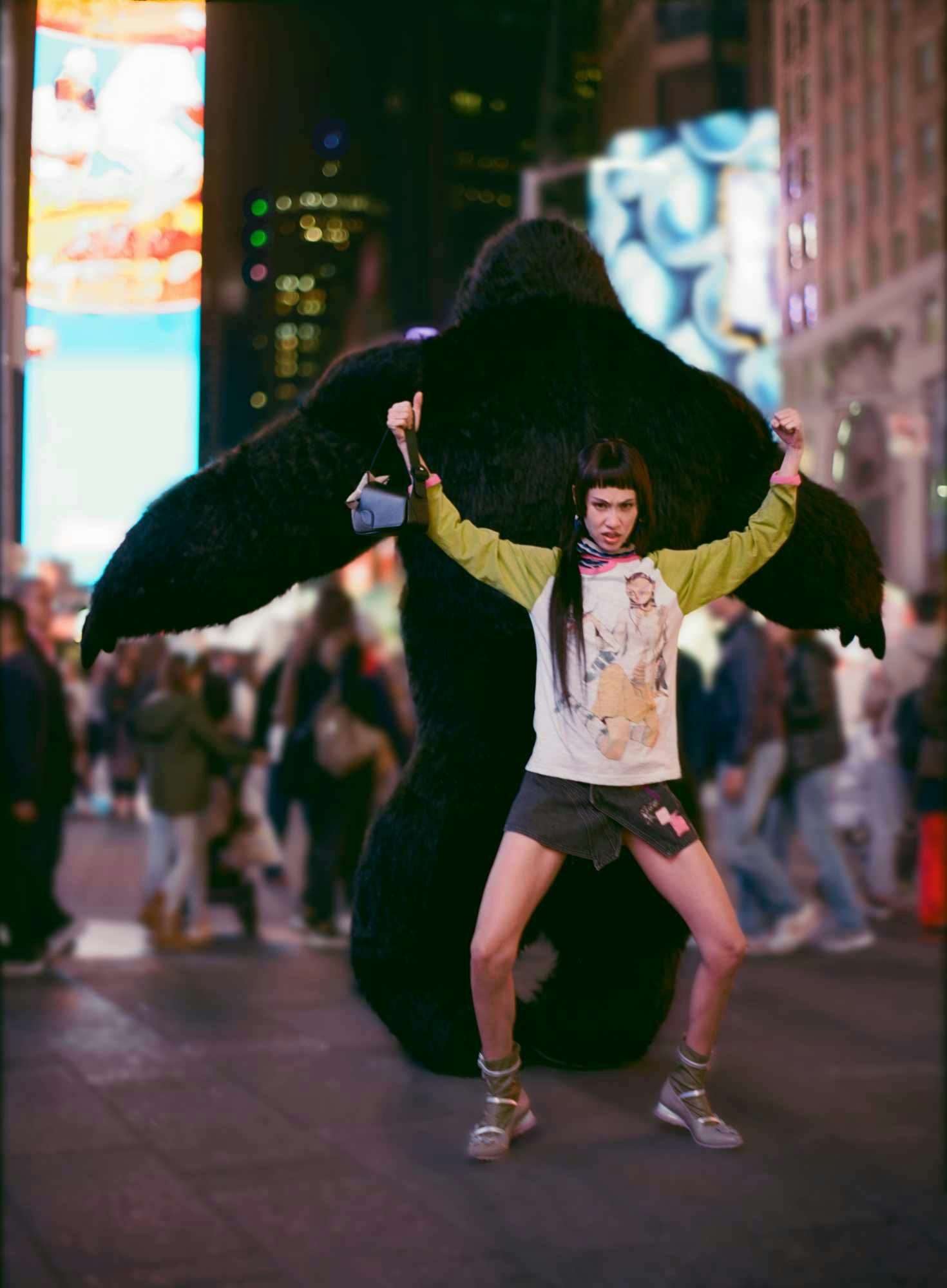 It’s gritty and girly, the vibe illustrated by campaign images of a young woman riding the subway and cuddling with a rat or looking bemusedly confident in the middle of an empty, brightly lit Times Square. This is the kind of person who needs Heaven and Kostadinov's GEL-LOKROS ASICS Mary Janes.