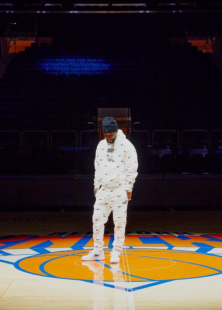 To complement the Forces, Kith, Nike, and the Knicks have created an off-court apparel and accessories collection consisting of more than a dozen styles. Ranging from hoodies and sweatpants to crewnecks and T-shirts, silhouettes are offered in a New York Knicks-inspired color palette of blue and orange. Nike's iconic Swoosh logo and the Kith classic insignia properly brand the collaborative items.