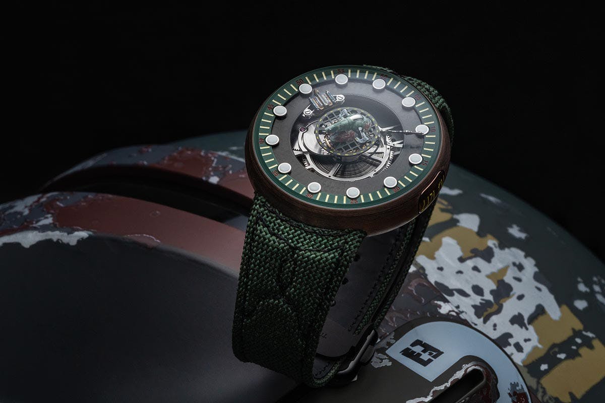 Created in collaboration with LucasFilm, the Swiss-designed piece featured Kross Studio's instantly recognizable central Turbillion, complete with a watch display by EFX that takes on the appearance of the bounty hunter's famed Slave I starship.