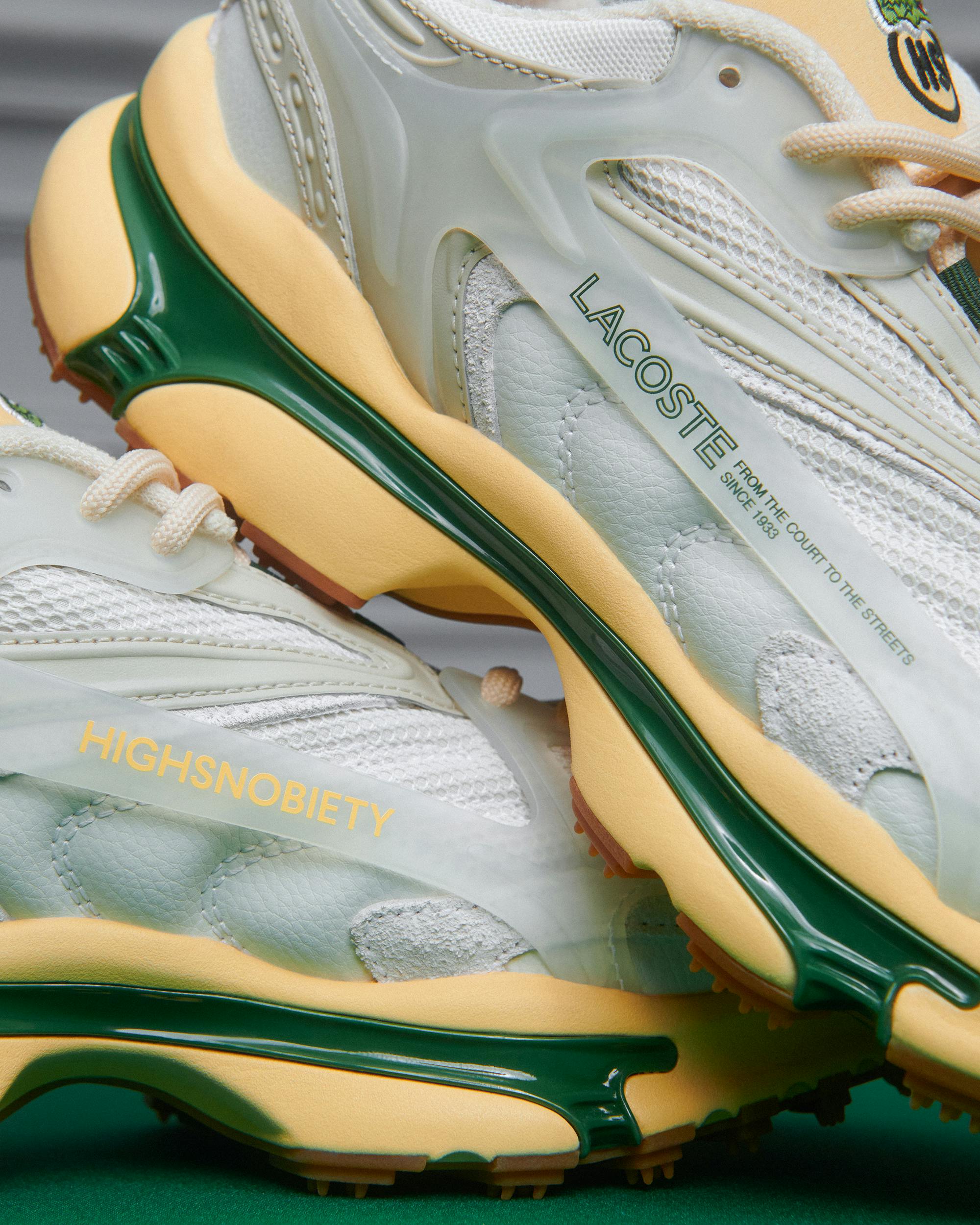 The whole collection is not only a landmark moment in collaboration culture between both brands but also a way of honoring founder René Lacoste’s vision: invention. If we look at the brand's footwear heritage, for example, it unveiled its first tennis shoe, ‘La René’, in 1958 — this marked the beginning of a very special sneaker journey. The ‘80s saw the brand fine-tune performance elements with (now archival) silhouettes like The Ardeur in ‘85 and The Indiana in ‘89. Recent years brought designs like the AG-LT21 and 23 Ultra, which put sports technicality and tennis science at the forefront. Safe to say, Lacoste is constantly perfecting and improving its sneaker selection and redefining footwear design every season — and the L003 2K24 Highsnobiety is no different.