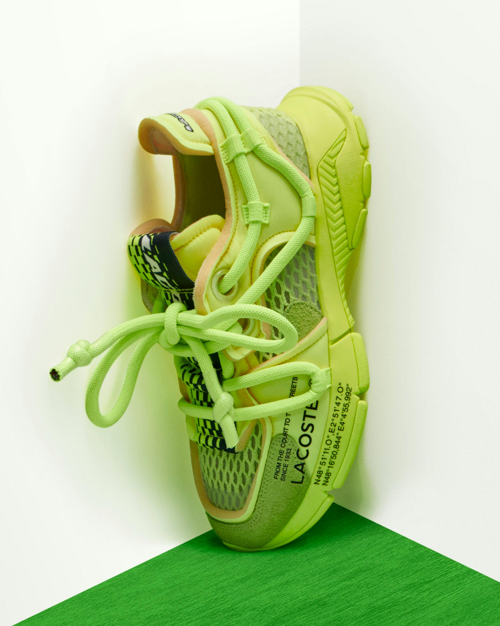 Much like its name, the L003 Active Runway is a bold blending of fashion aesthetics with house sports codes. Built off of the bones and identity of the original L003 sneaker and sandal concept shoes that were unveiled during the SS22 fashion show, the Active Runway comprises open-edge raw neoprene, an exaggerated fat lace, suede upper, and breathable fabrics like feather light nylons and oversized mesh. The shoe also comes in a neon green colorway which not only is a nod to a tennis ball but to Lacoste’s heritage and identity. So you can really see how the brand brings tennis history to the streets, driven by the bravery to shift the needle of design, much like Monsieur Lacoste himself. I mean, before you change the game, you need to play it — and this sneaker nods to that maverick attitude.