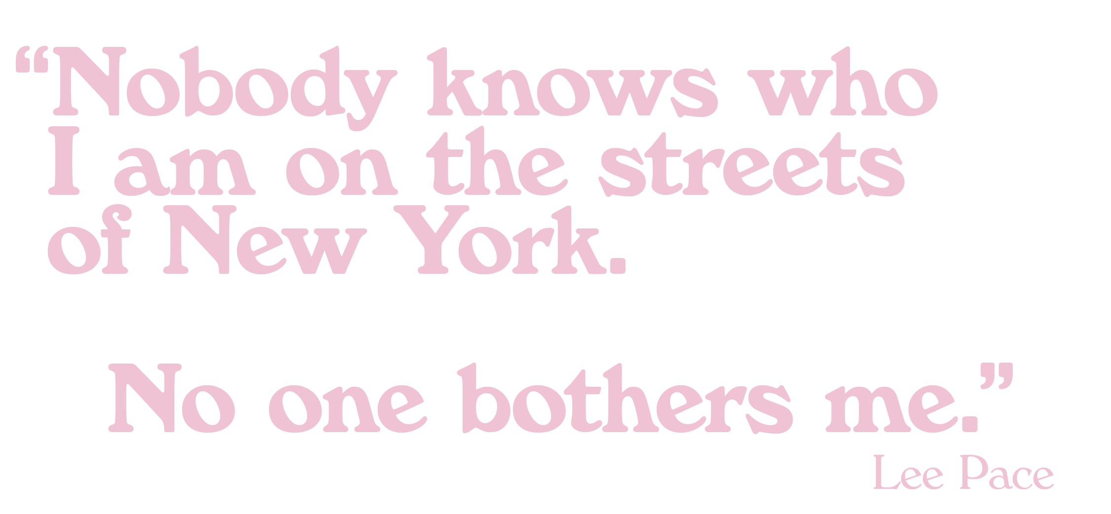 It’s hard to imagine a terrain where he wouldn’t be able to find his footing. But Pace says that these days he feels most comfortable in New York, although it’s rare that he’s here for a month straight without having to leave for work. “I’ve been in New York in one form or another since I was 17. So I can’t imagine being anywhere else,” he says. “There are times when I love it, and there are times when it’s a really frustrating place to live, crowded, changing in ways. I guess that’s part of getting older: things change.”