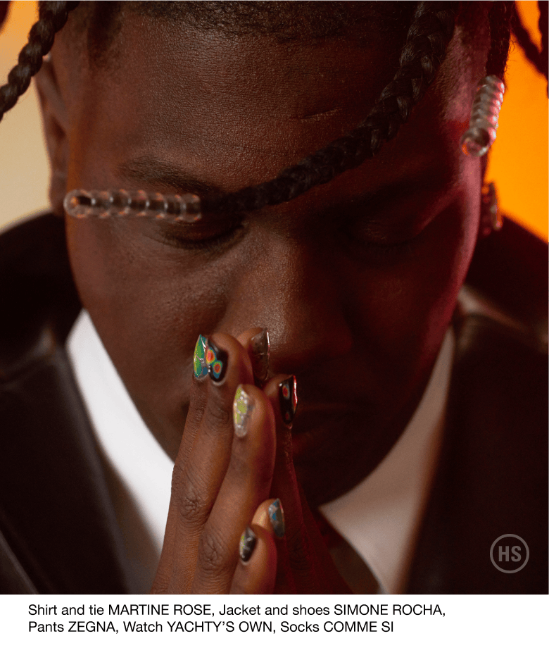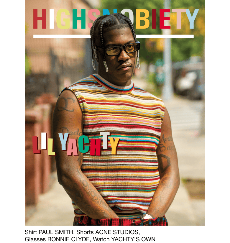 Today, Yachty tells me, he’s taking a more natural approach to his personal dress. “I’m at the point in my life where I’m just really careless,” he says, reclining on a couch. “I’ve had this striped T-shirt since high school. I used to wear this when I was broke. Real chill shit.” When I point out that the Chrome Hearts jeans and Gucci x adidas Sambas he’s paired that T-shirt with aren’t exactly what I would classify as “chill,” he concedes that it’s more about the feeling they bring. “It’s just Lil Yachty — same wrinkled vintage T-shirt, same jeans, and I just do everything. Monday I’m making strip club music, Wednesday is church, Thursday is score music for some thriller movie. We’re just doing shit,” he says. “Not as C.V. Thomas, not as some other character. Just as Lil Yachty.”