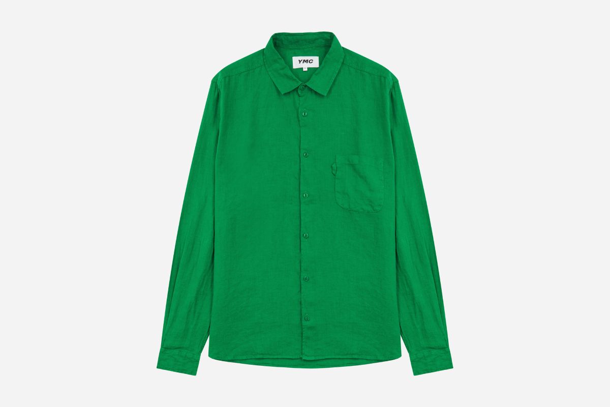 Crafted from lightweight linen, this juicy green shirt by YMC is as vibrant a color as it gets, perfect to blend in with natural backdrops.