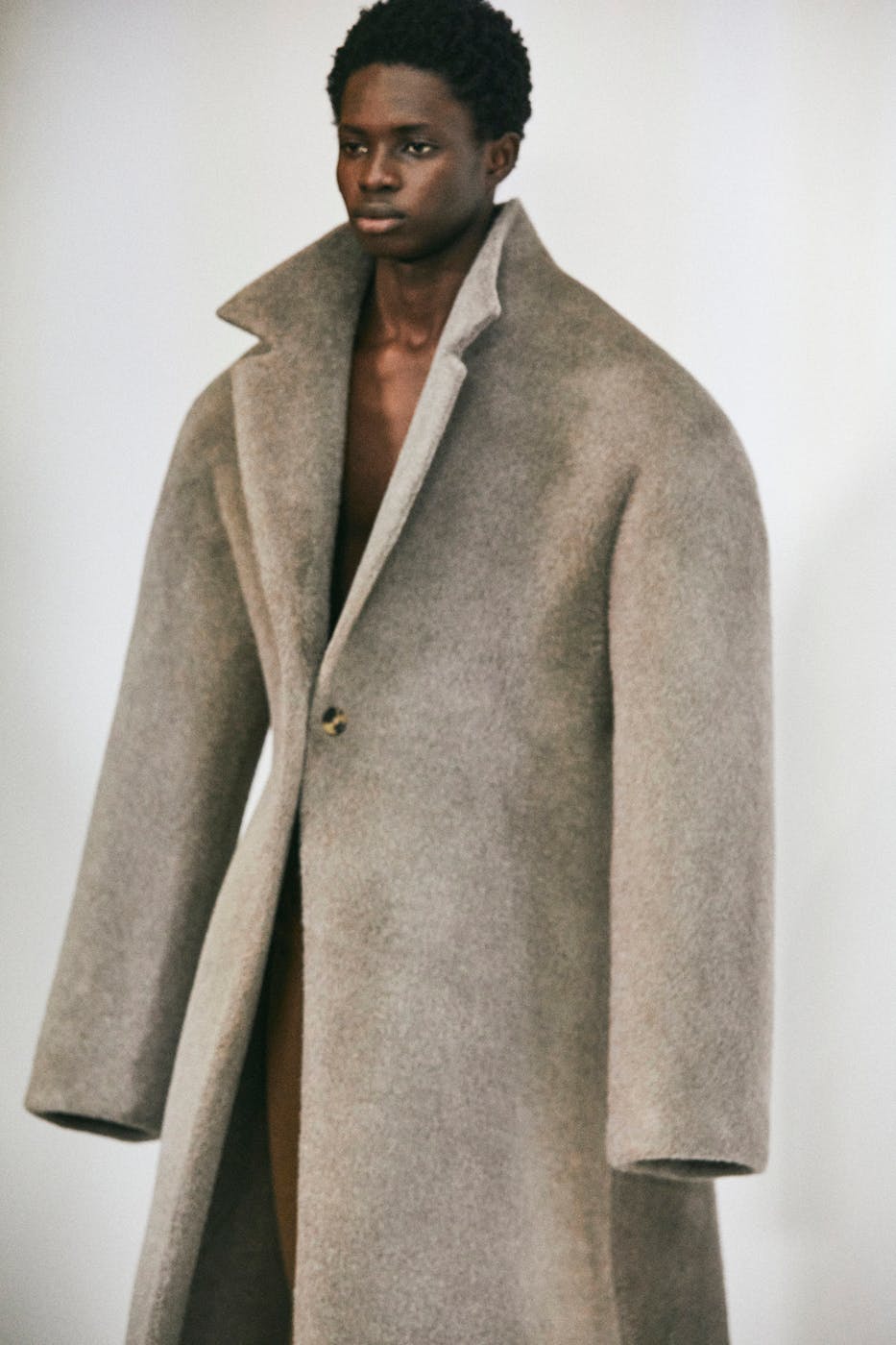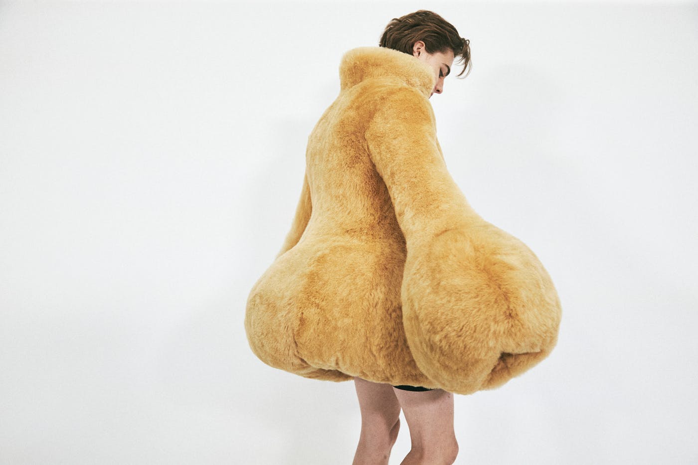 Witness the shapes at the core of LOEWE's Fall/Winter 2023 collection: bell-sleeved faux fur jackets, densely knit cardigans, overcoats sealed into a vareuse pullover (very Margiela Hermès), padded wool felt jackets that're so stiff that they wrap the body in rigid shapes.
