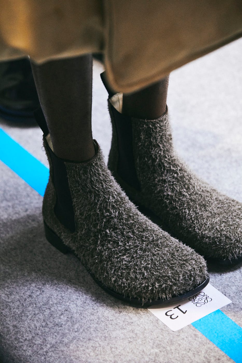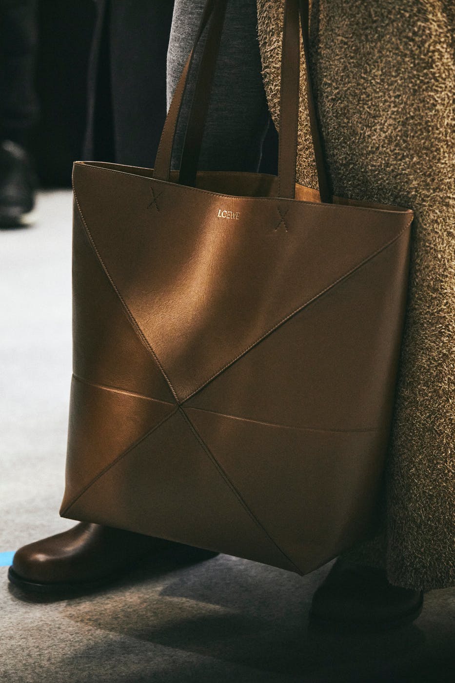 Thus, the ensuing attitude was one of utter ease. Getting dressed in LOEWE FW23 just means pulling on a thick jacket, slipping into some fuzzy shoes, grabbing your exquisite leather handbag and hitting the road.