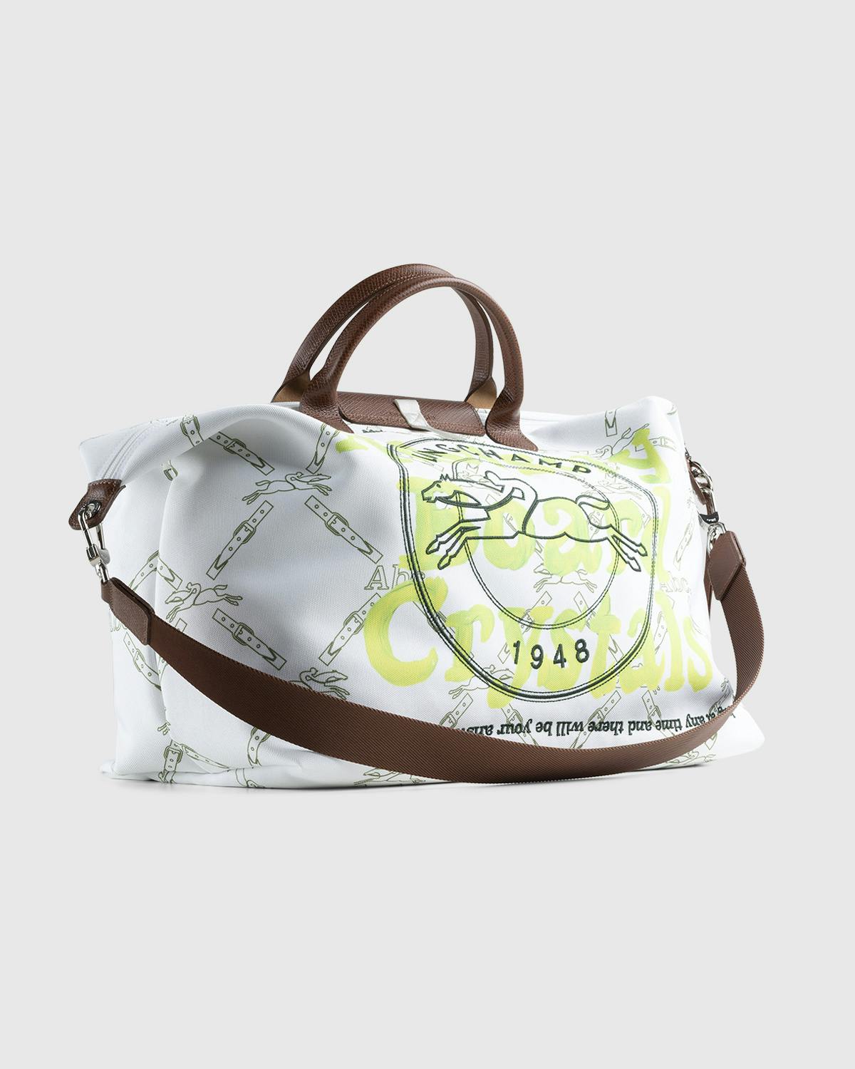 The rest of the bag finds Longchamp's horse print emblazoned across its body in black against the white recycled polyester canvas body. Green Abc. motifs are then printed boldly across the front and back of the design, layered beneath Longchamp branding and the Advisory Board Crystals Institute of Art and Science crest.