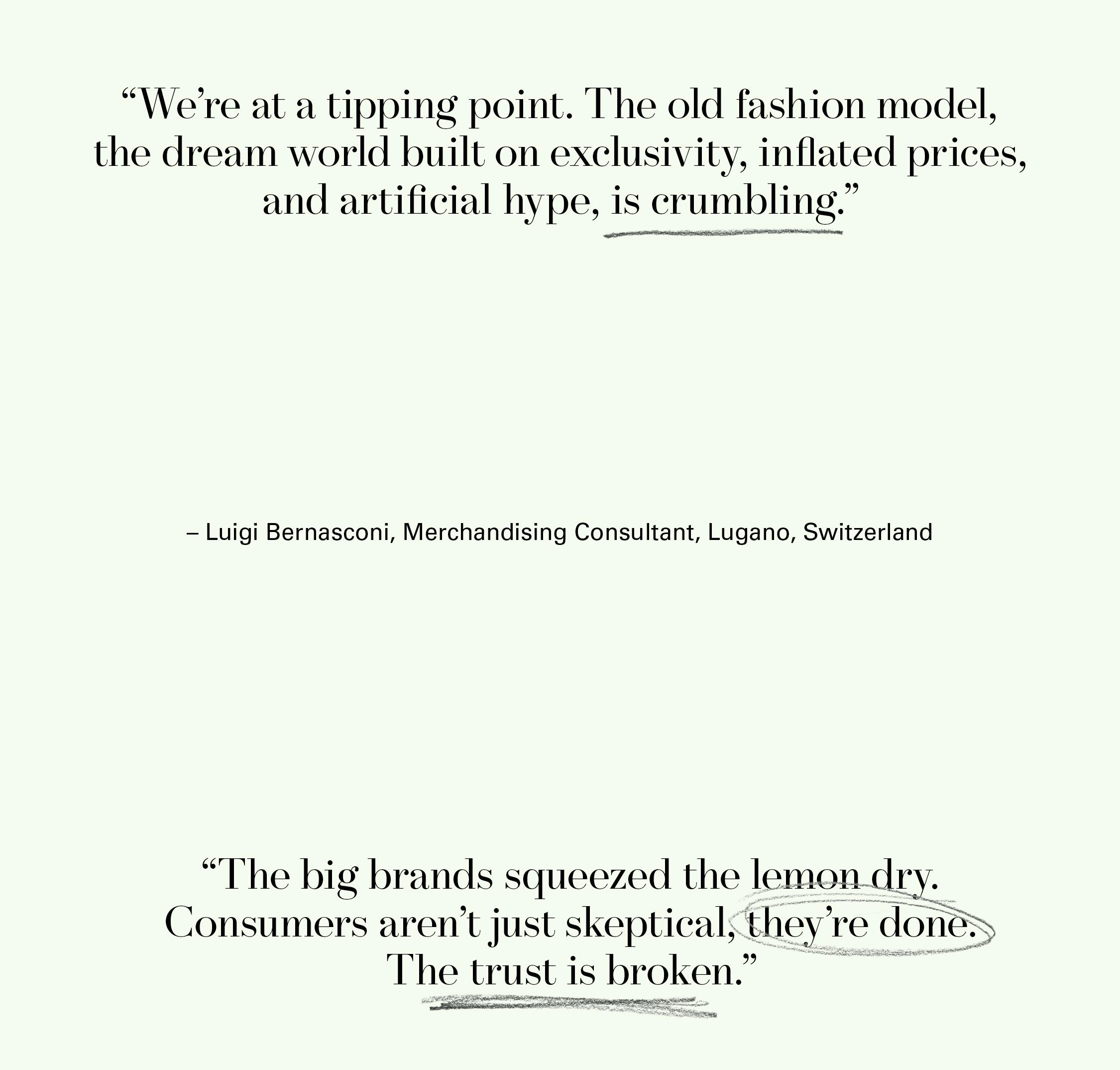 “For years, we were sold an illusion: that price was justified by craftsmanship, creativity, and heritage. But as transparency seeped in, it became obvious what we were really paying for was an aura, a constructed mystique, a marketing machine that ran out of fuel.” —Luigi Bernasconi