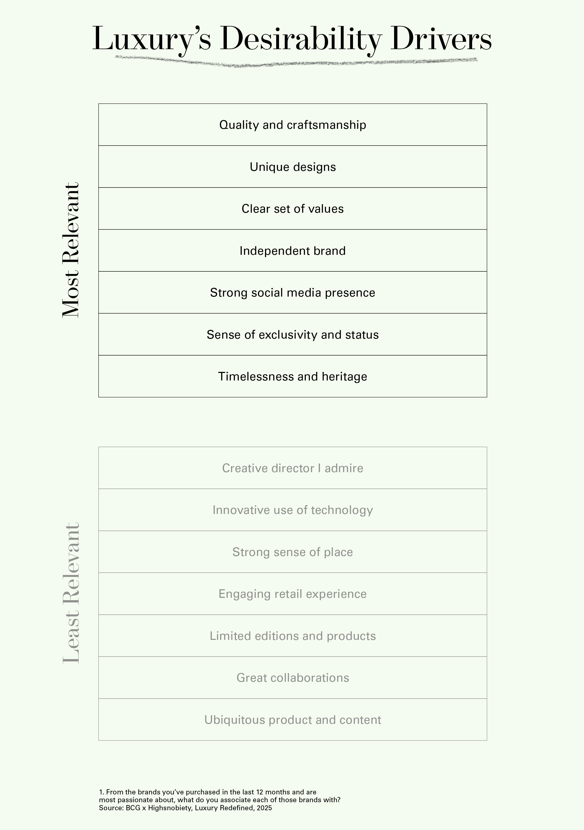 Luxury is still in demand, if in a different way. The top drivers of desirability for today’s luxury consumer – craftsmanship, uniqueness, clear values, and independence – are all related to the quality and the story behind a brand or product, not the marketing of it. Factors that are low on the list include collaborations, creative directors, and associated influencers – things that drive hype and engagement but not meaningful connection.