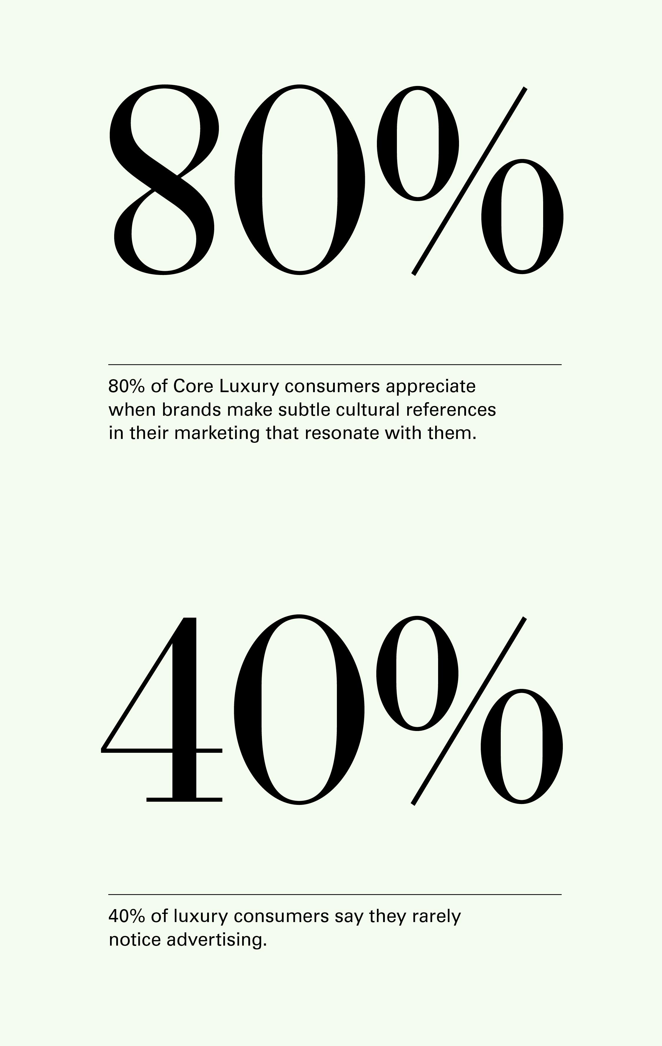 Eighty percent of Core Luxury respondents said they agree with the statement, “I appreciate when brands make subtle cultural references in their marketing that resonate with me.”