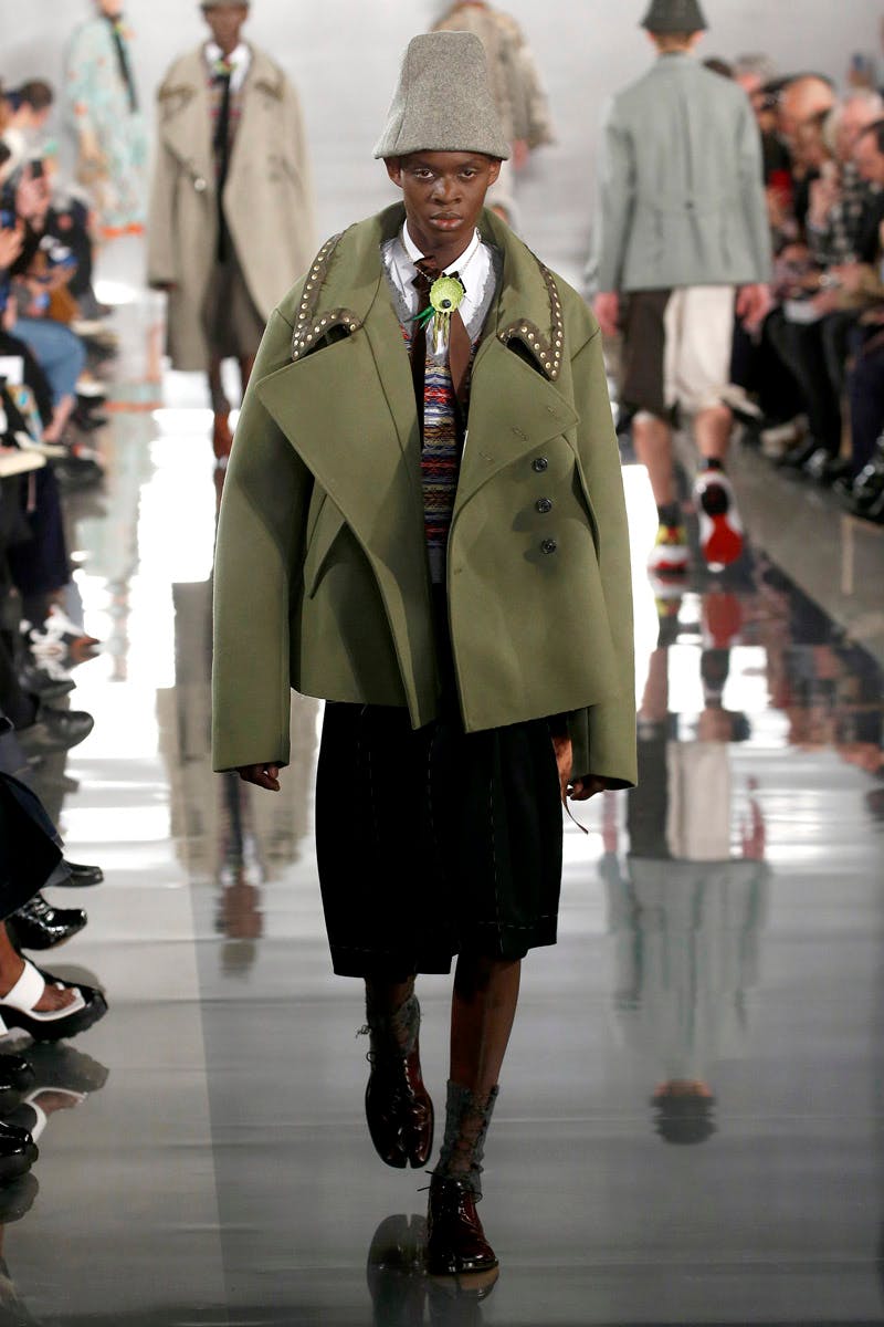 In lieu of any full-length pants, this collection saw shorts, ribbon-tie culottes, and kilts styled with distressed socks pulled up to the calf. The outerwear was complex, with items folded and combined together with the label's signature exposed stitching and cut-out garments layered on top. The vibe was less "deconstruction" and more "mid-construction," as if you had to dash out of an atelier half-way through being dressed by a team of Parisian seamstresses.