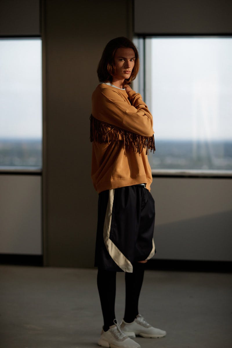 Some key pieces from SS19 would be the duo-tone hoodies with double drawstrings around the hem, which were separated vertically in shades of grey and lilac, and the rectangular, loose-fitting shorts which were a perfect compliment to Asbjørn's slouchy, slightly cropped sweaters.