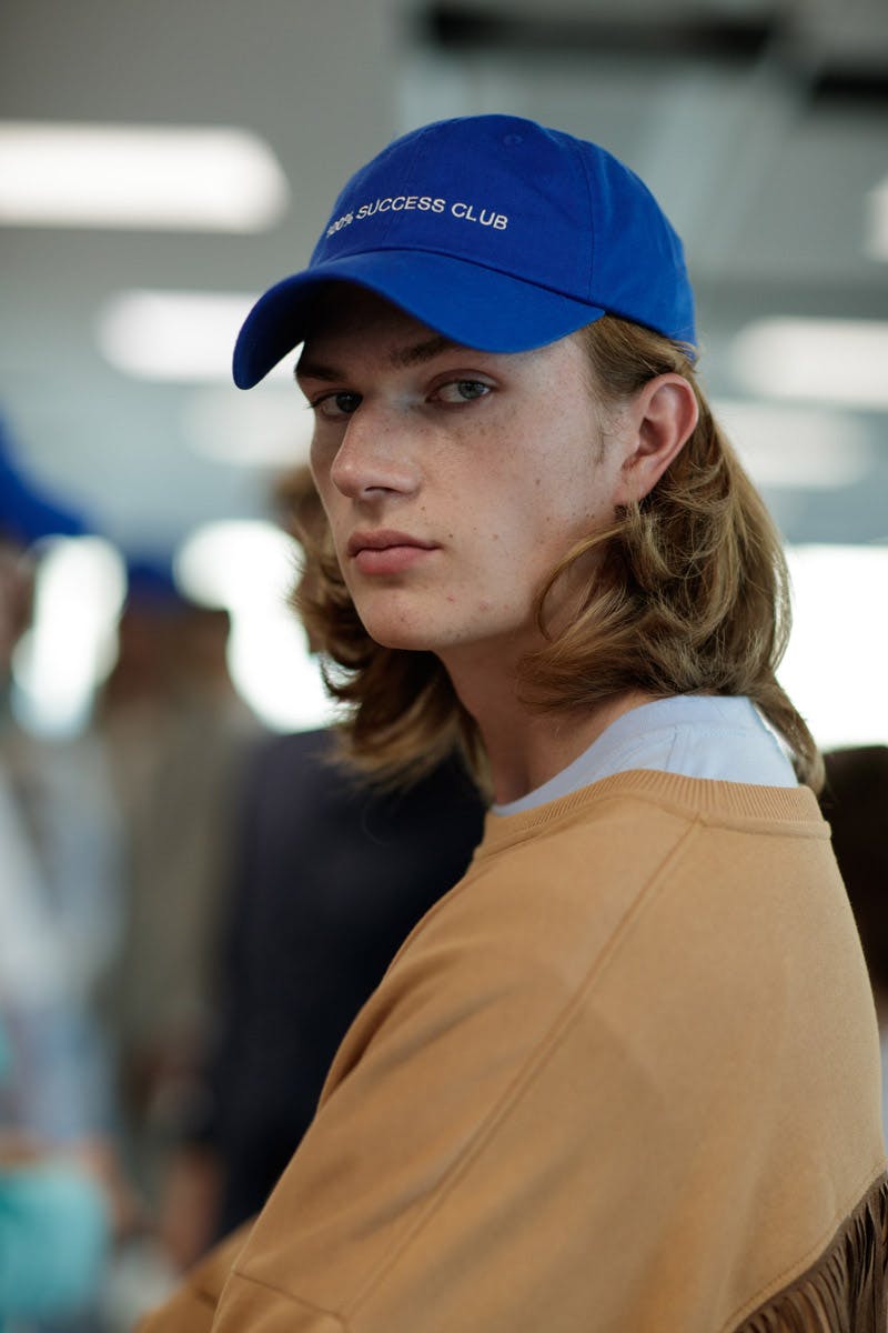The collection, in a bright and typically Asbjørn palette of aquamarine, lilac, white and tan, consisted of althleisure and tailoring with a big focus on fringing and quality fabrics. The decorative threads swayed off the back of sweaters, jackets and even down the seams of pants, cowboy-style. A cap, in royal blue, with “100% Success Club,” wasn’t even trying to be ironic — like Asbjorn’s previous collections, this was about menswear that seeks a kind of confidence and runs with it.