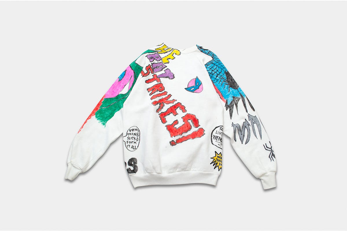 Key Pieces: The Elmo: The Lost Years sweater is a standout. The 1-of-1 hand drawn vintage garment shows a Sesame Street hellscape complete with drug-addled childhood characters wielding knives, and text such as “Everything Sucks Fuck It All,” in Faust's DIY style.