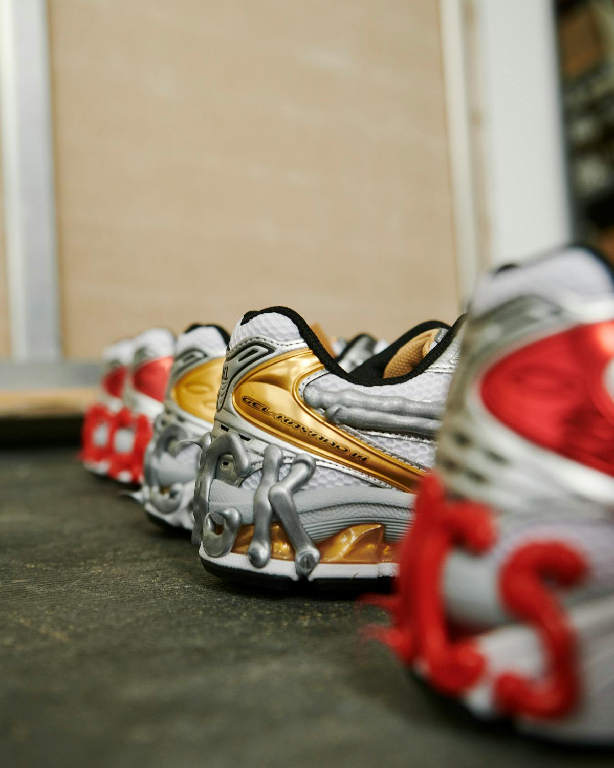 For this special project with ASICS, Buck brings his trademark buoyancy and humor. It’s unmistakable when looking at the custom shoes that they’re Dennis Buck originals. Approaching the all-black GEL-KAYANO 14, he “wanted to make a more bulky shoe” and lined the sole with rows of black silicone. Alternately, the red and gold colorways are spruced up with silicone in the corresponding color and have the words BUCK and ASICS spelled out across the back of the heel (just in case you forgot whose work you’re looking at).