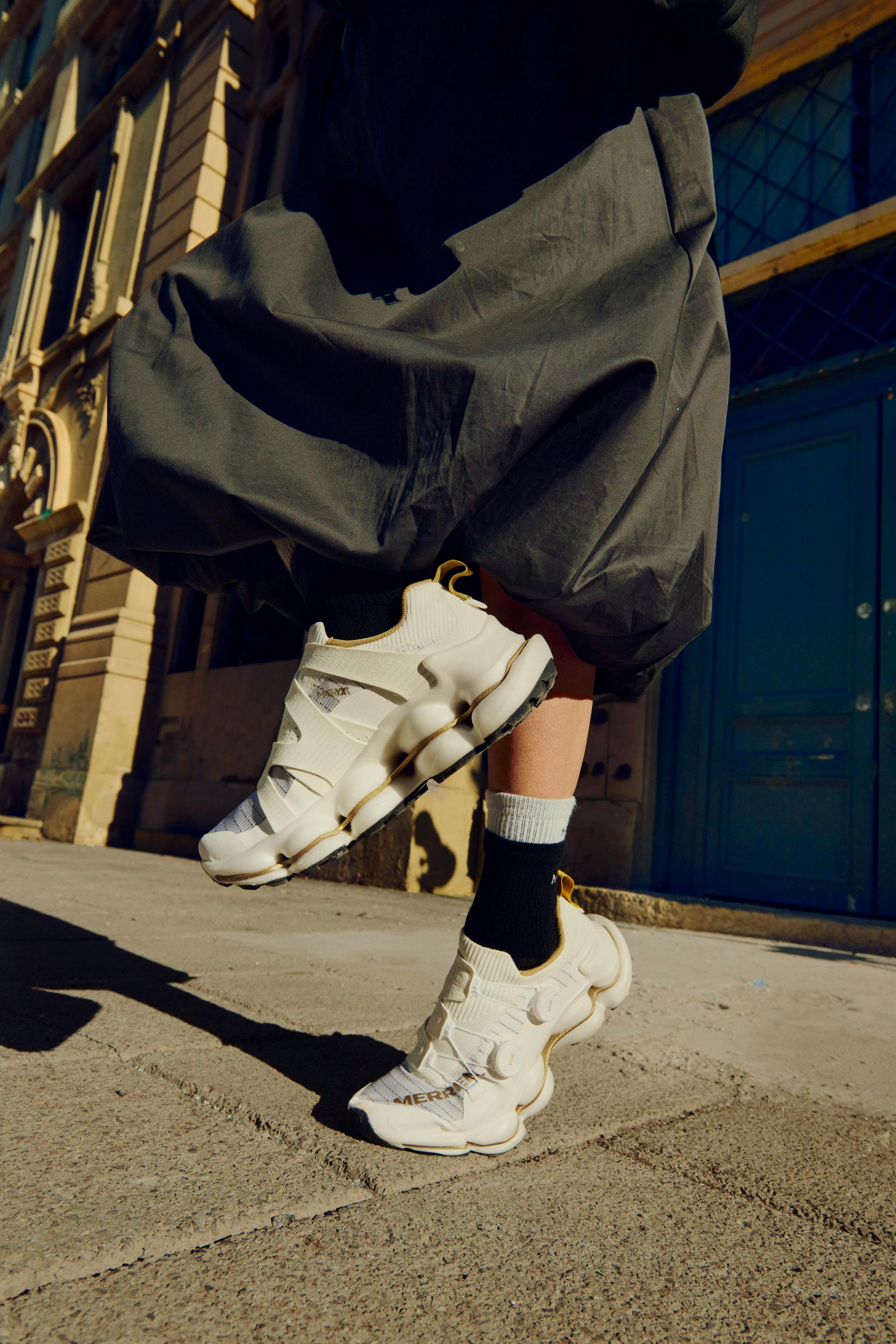 Imagine bouncing between trees on a pumped-up dirtbike — that's the vibe of strolling in Merrell's new baby.