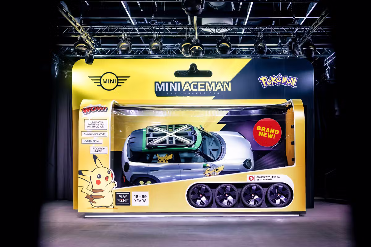At Gamescom, the idea was brought to reality in giant, life-size toy packaging, engulfing an adult viewer as if they were the size of a kid. The toy packaging included a live-sized Pokémon branded MINI Aceman as well as playful instructions, stickers, and shout-outs to special features on the back, such as the detachable boombox, an extra set of rims, and a step-by-step guide on how to use the OLED display and integrated beamer.