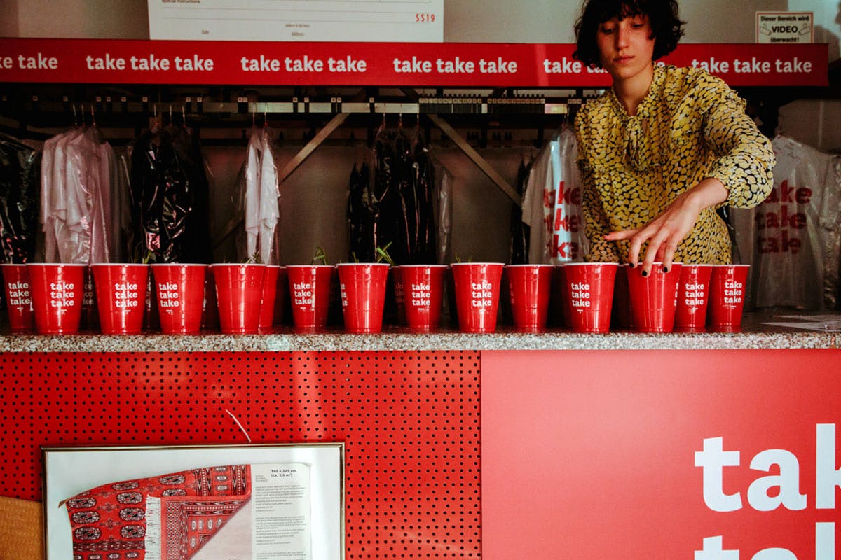 Further playing to the theme, attendees could exchange their event invite, which was designed in the style of a dry cleaner's receipt, for a fresh-pressed t-shirt or hoodie emblazoned with the collection's slogan "take, take, take."