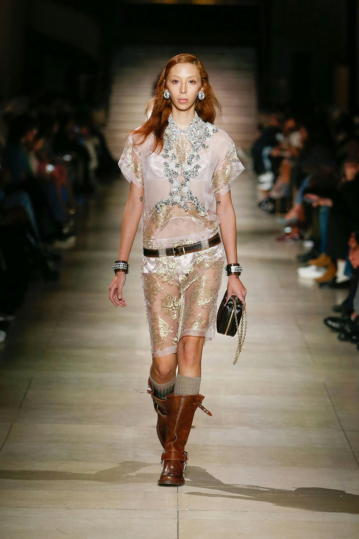 There were motorcycle boots and leather lace-up pants, rough and tough pieces that gave way to soft, sweet ballet flats worn with leg-warmer like socks (balletcore has always been a Miu Miu speciality, even before TikTok's embrace of the athletic look).