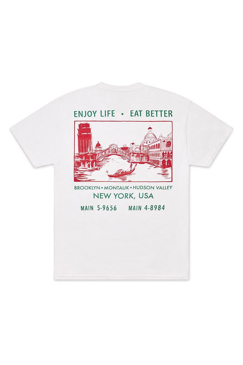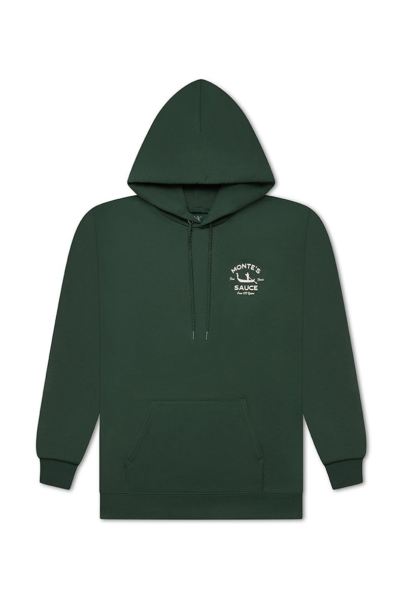Curating artwork from old matchbooks, branding, and ads, the collection of cozy clothing features plenty of colorful creations that draw directly from the Monte family legacy. The little gondola man from the Venetian Room in Monte's OG outpost graces the rear of a green hoodie, while a long-sleeved shirt proudly proclaims a line from The New York Times' recent sauce review: "Old New York in a jar." Elsewhere, another Venice-inspired ad graces a tee, and a simple cap sports Monte's stylized tomato plant branding.