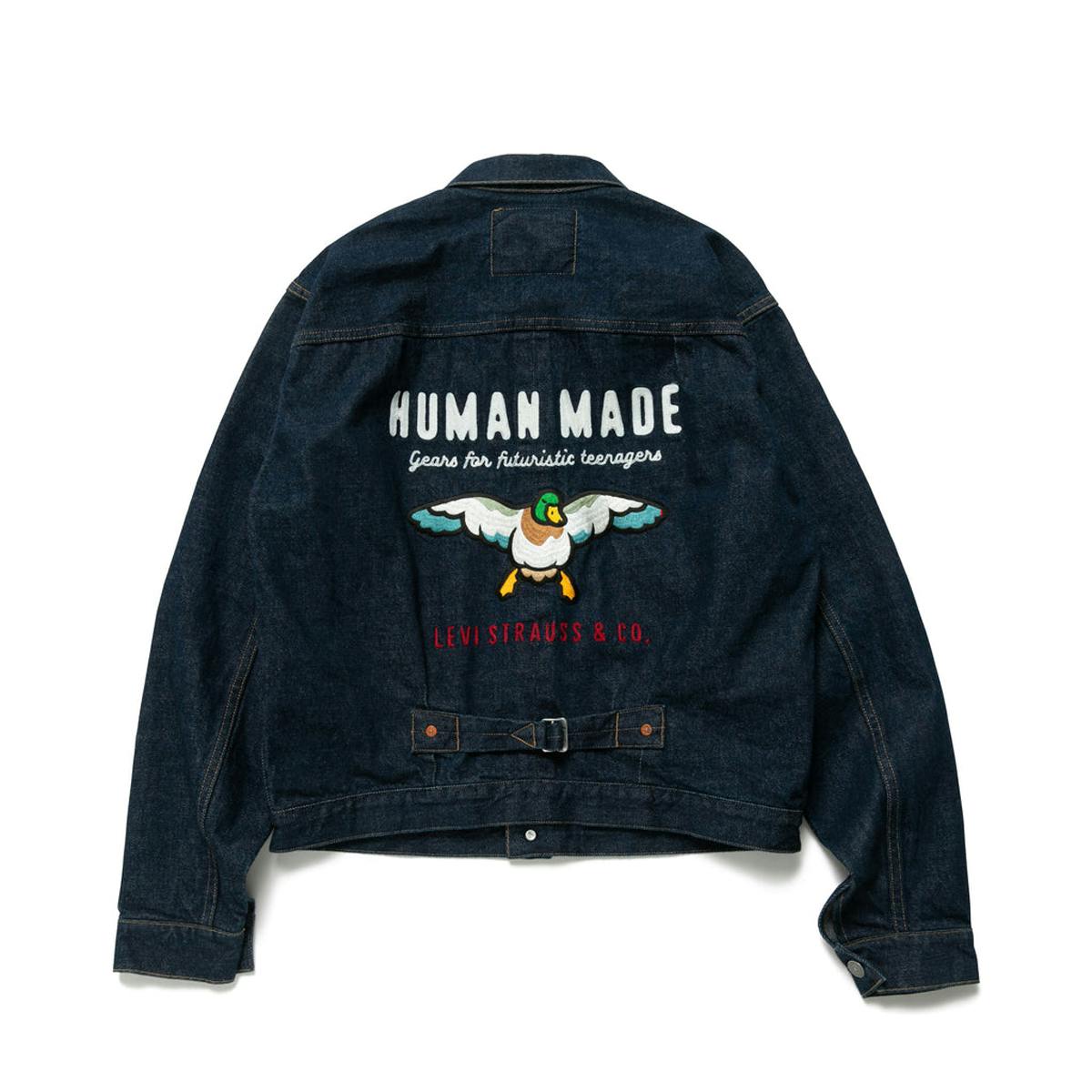 The rear of the collaborative trucker jacket features an embroidered Human Made graphic consisting of the brand's "Gears for futuristic teenagers" slogan and flying duck graphic. Levi's logo is stamped under the graphic in red, solidifying the team effort of the collab.